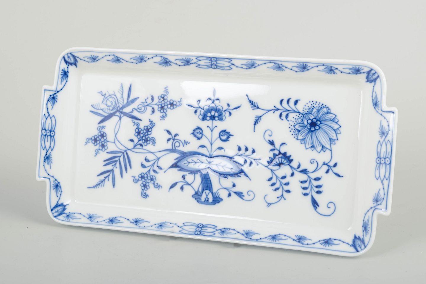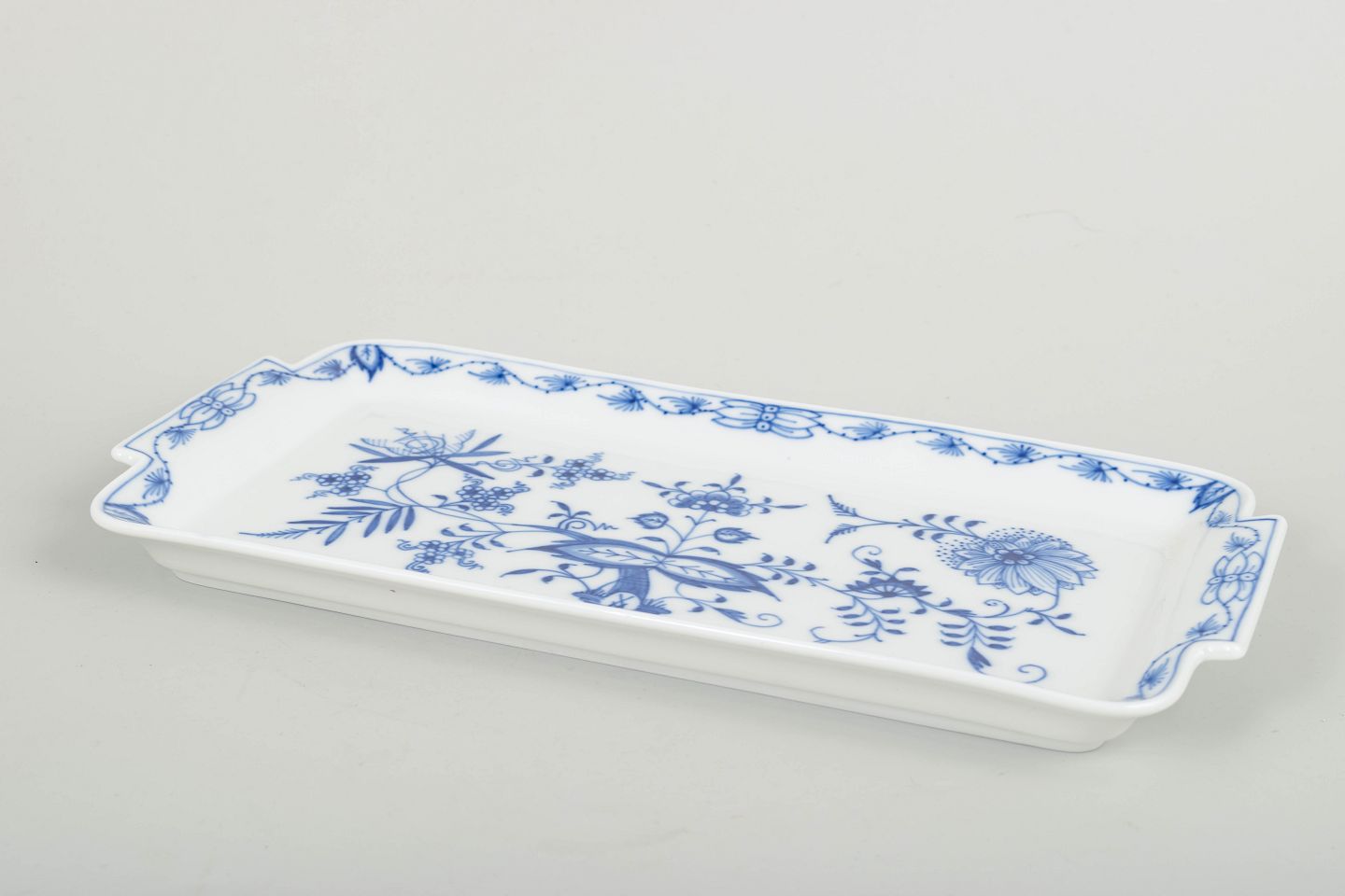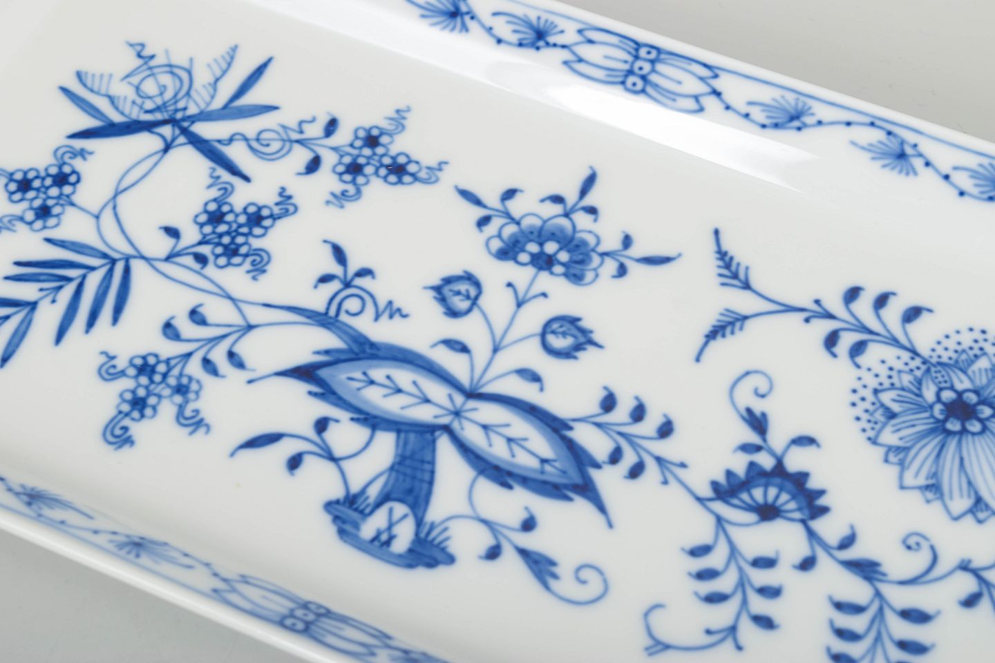 Meissen løgmønstret, stor bakke.Rektangulært serveringsfad i det klassiske løgmønstret (Zwiebelmuster) med håndmalet blå underglasurdekoration og let buede greb.