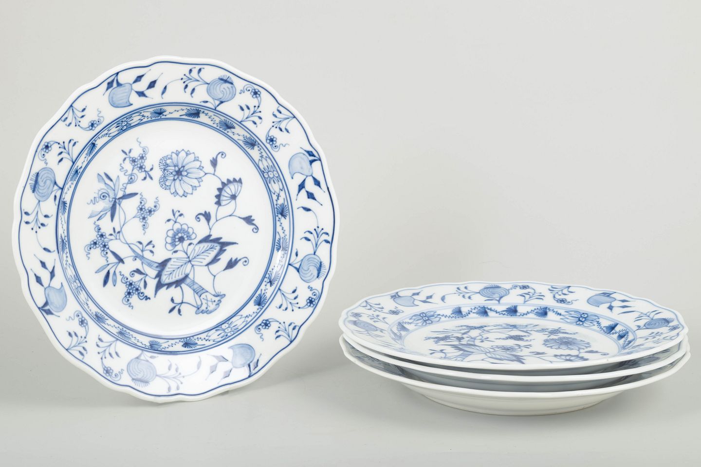 Meissen løgmønstretFire middagstallerkener, tidligt 1900-tal.