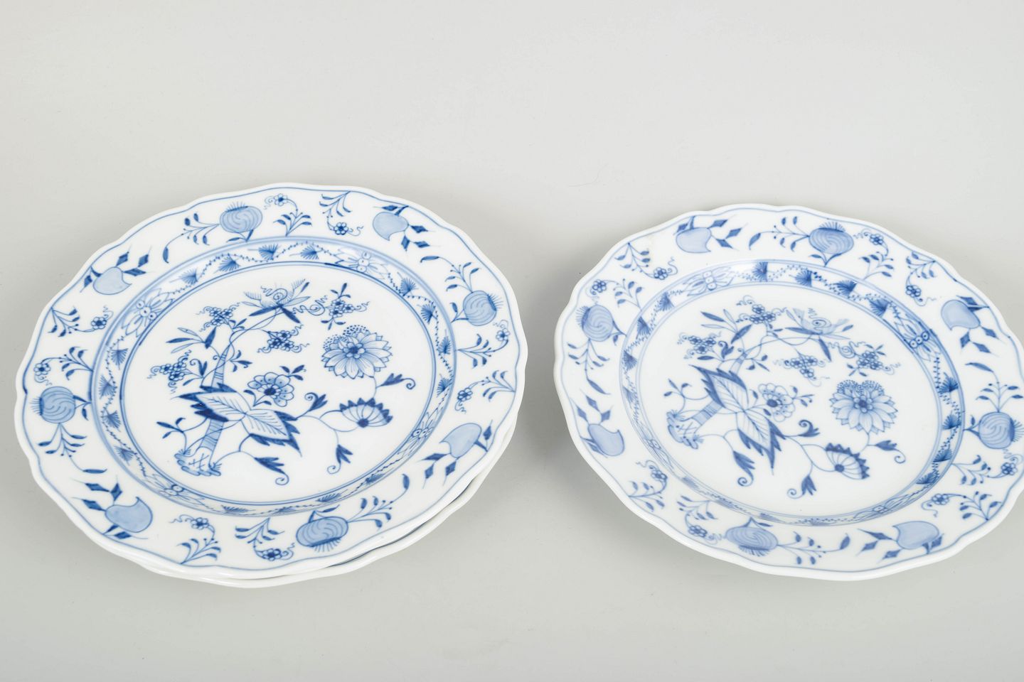 Fire klassiske Meissen-tallerkener i løgmønstret med bølget kant og håndmalet blå underglasurdekoration. Et tidligt 20.-århundredes sæt i fin kvalitet.