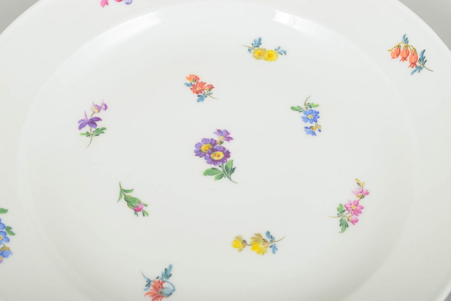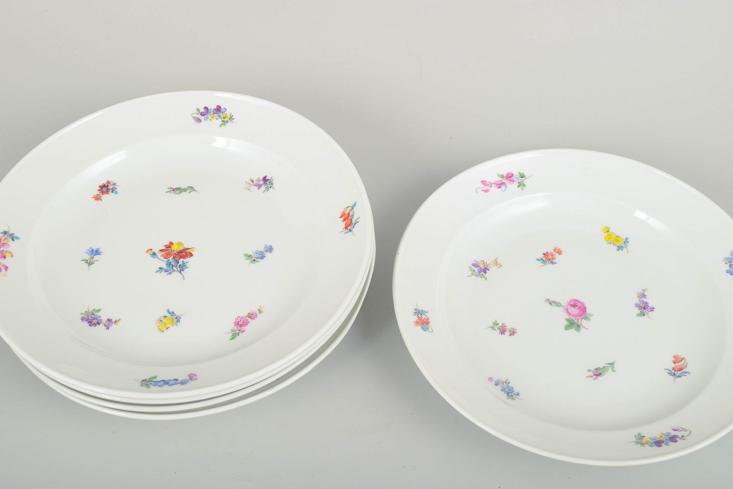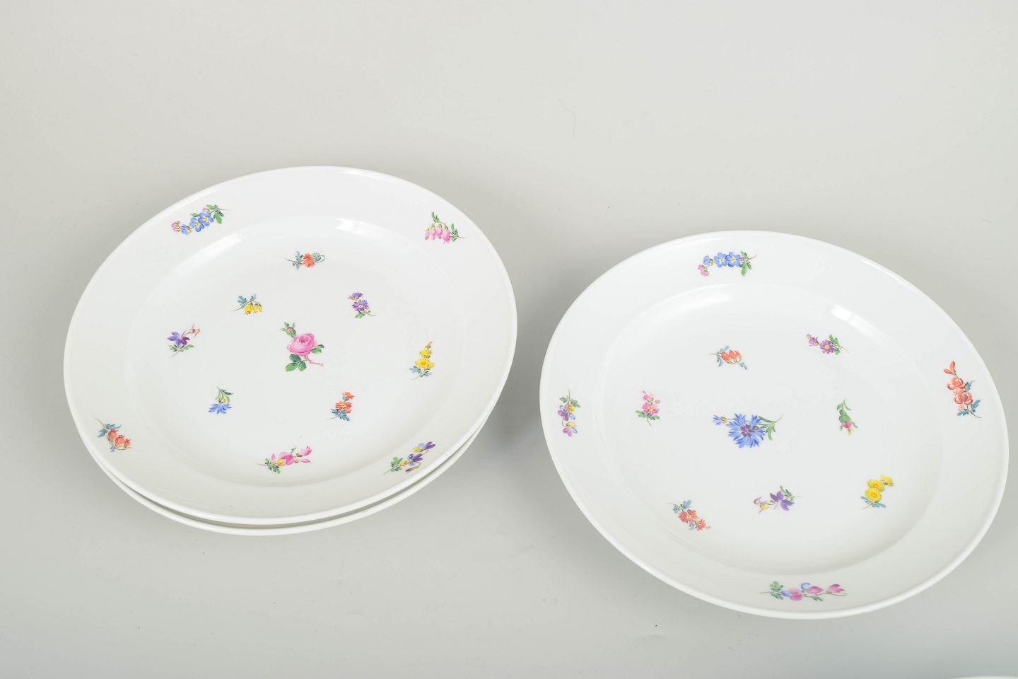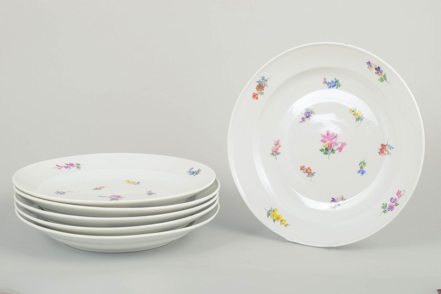 Meissen, Tyskland, sæt af seks middagstallerkener.Smukke Meissen porcelænstallerkener med håndmalede polykrome blomsterdekorationer langs randen og i midten. Klassiske, let svungne former i traditionel Meissen stil.