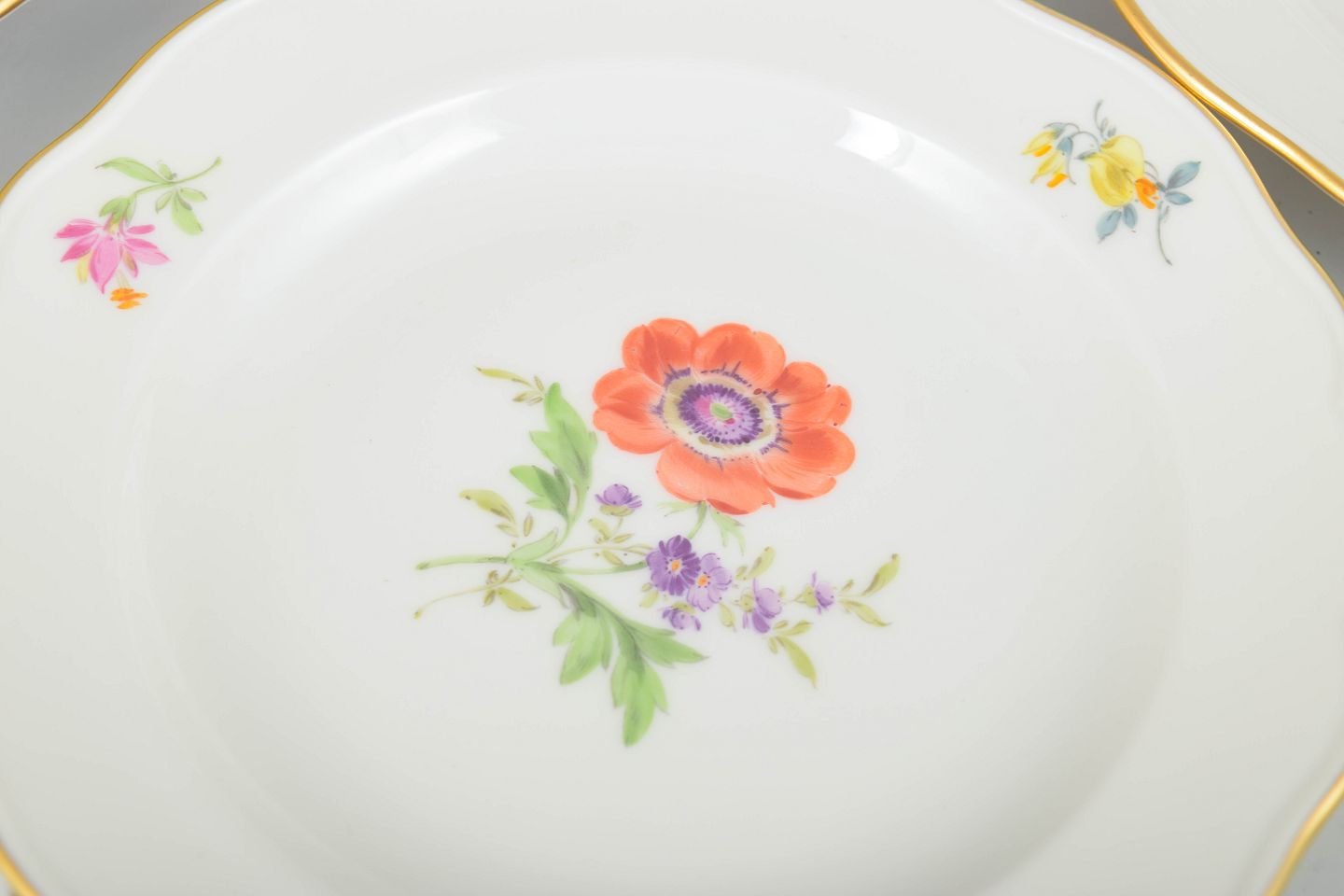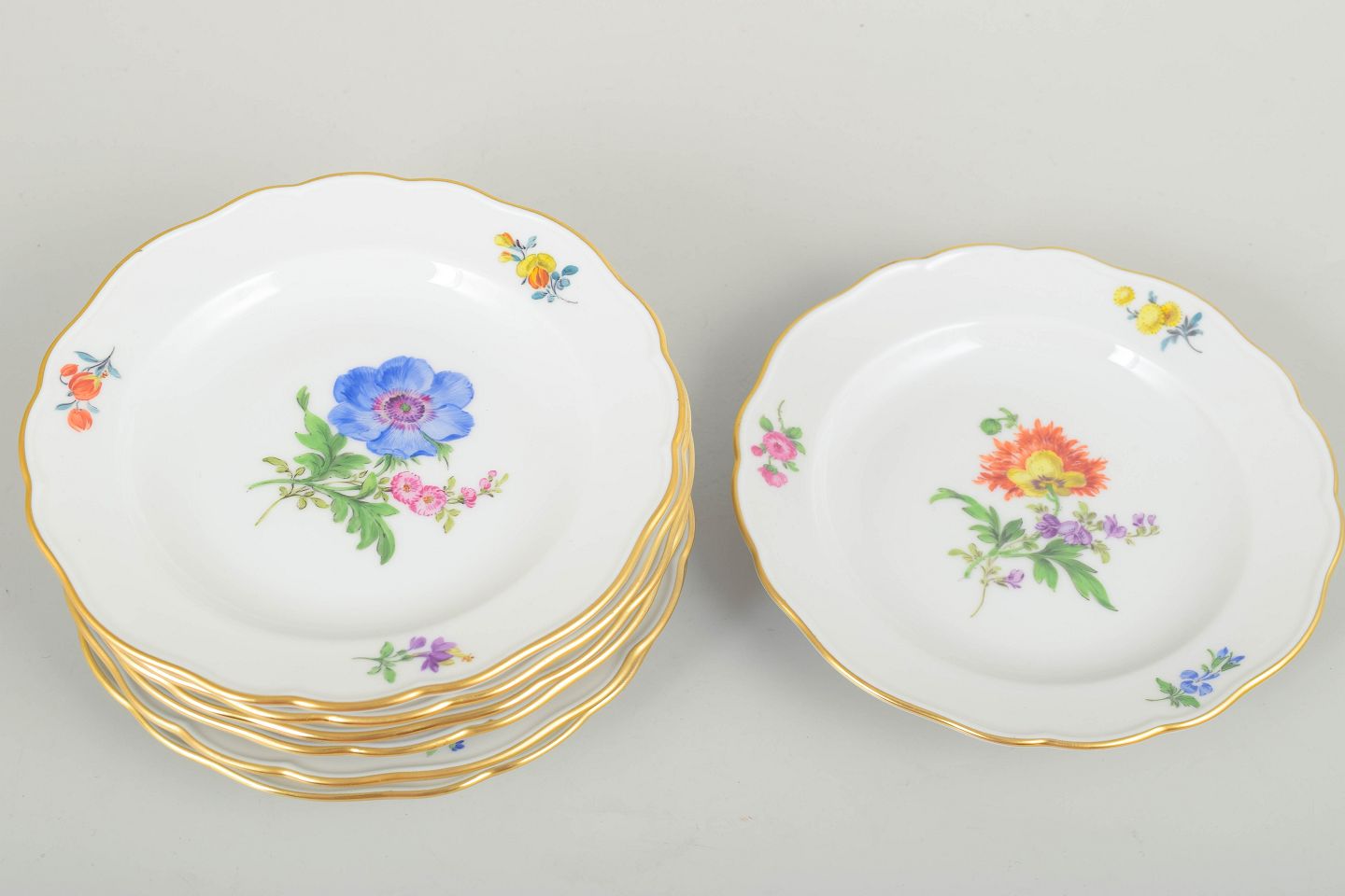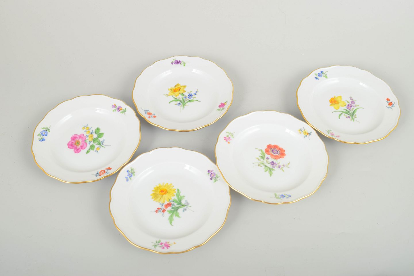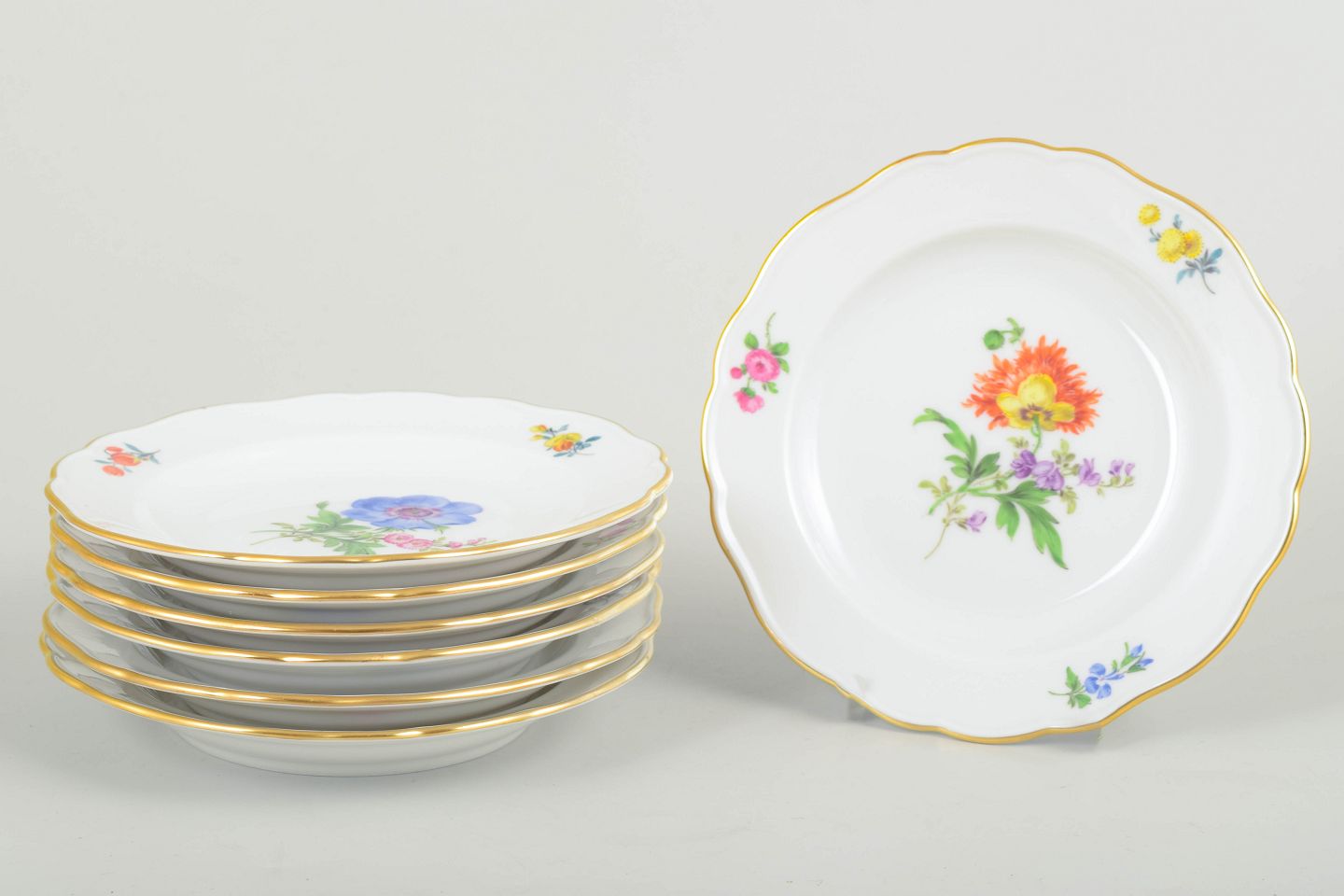 Sæt af syv Meissen sidetallerkener i porcelæn med håndmalede polykrome blomstermotiver og elegant guldkant. Klassiske, svungne former i traditionel Meissen-stil.