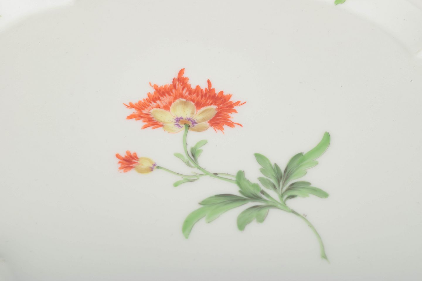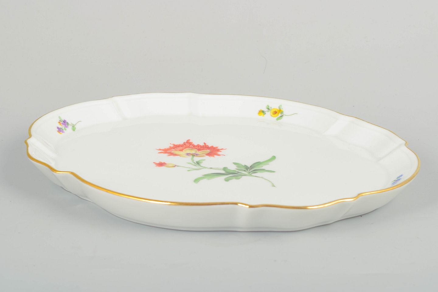 Oval Meissen-porcelænsbakke med håndmalet blomstermotiv i polykrome farver og fin guldkant. Smukt profileret og svunget rand.