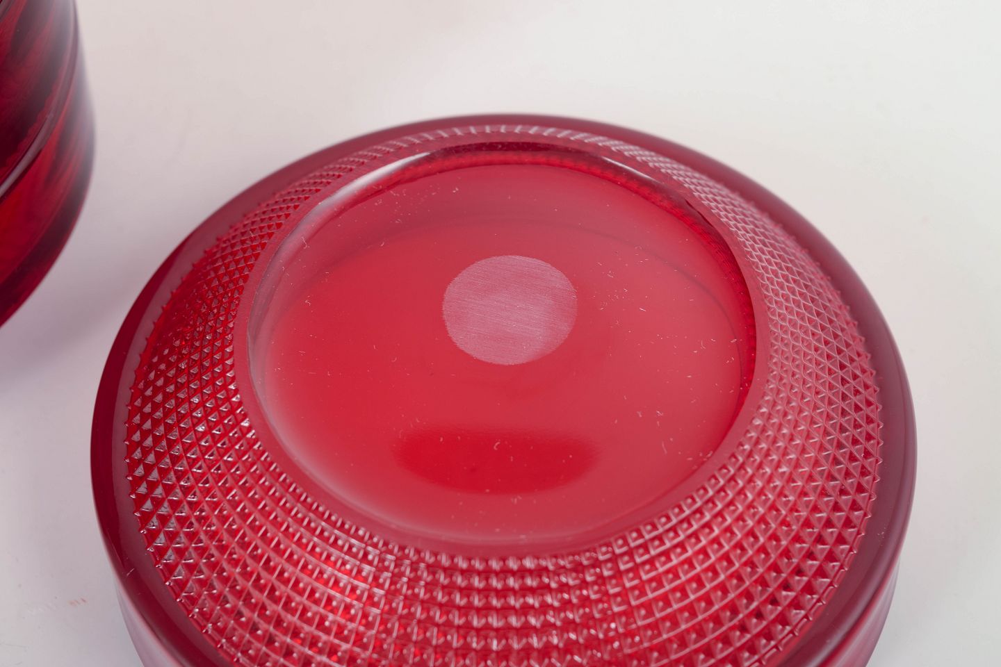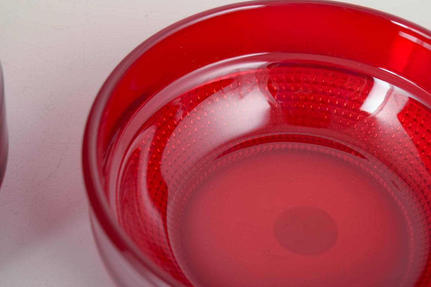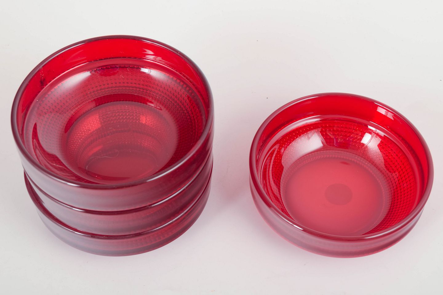 Sæt med fire dybe skåle i rubinrødt glas fra Gullaskruf, model “Vineta”, kendt for sin optiske struktur og dybe farvemætning. Elegant og tidstypisk svensk glasdesign.