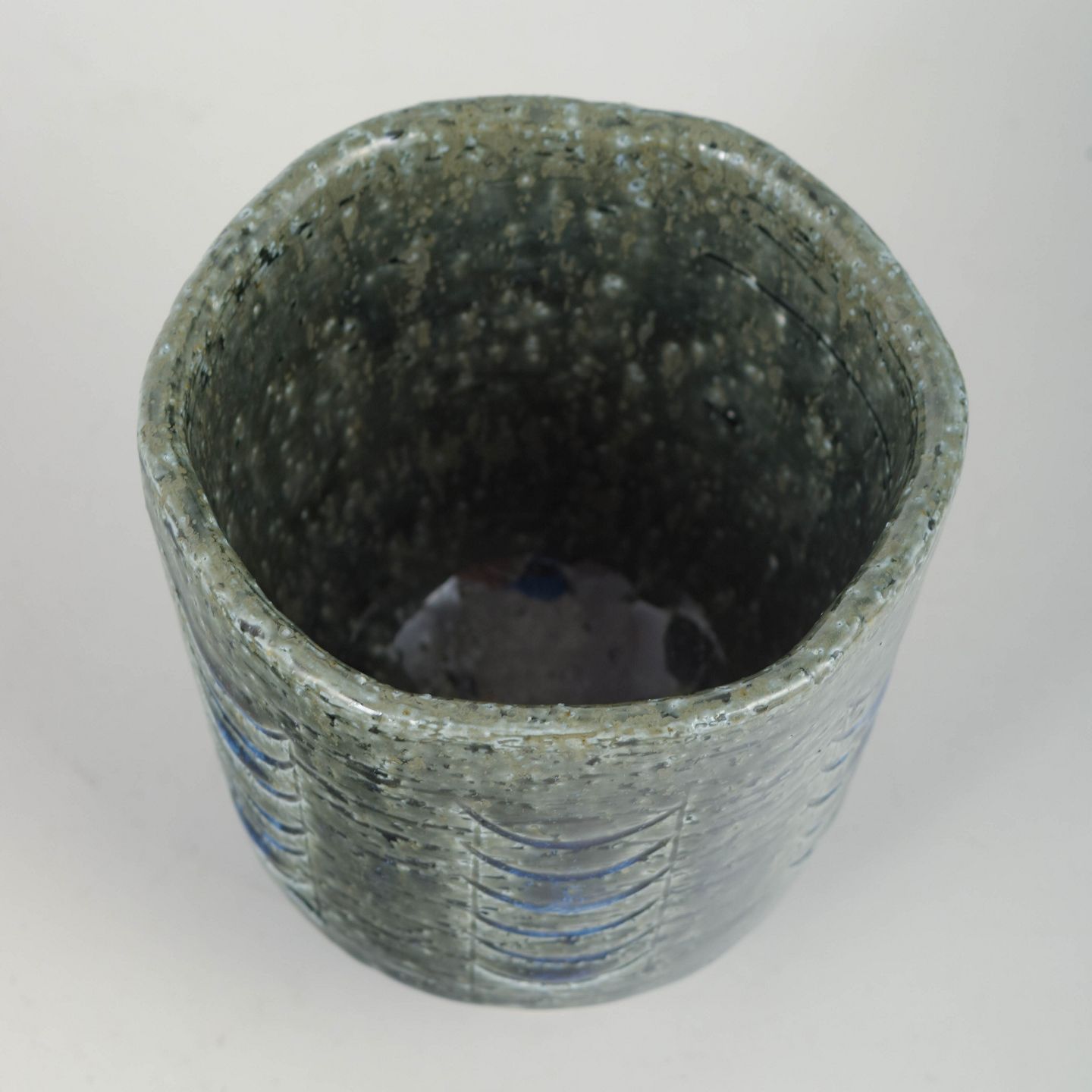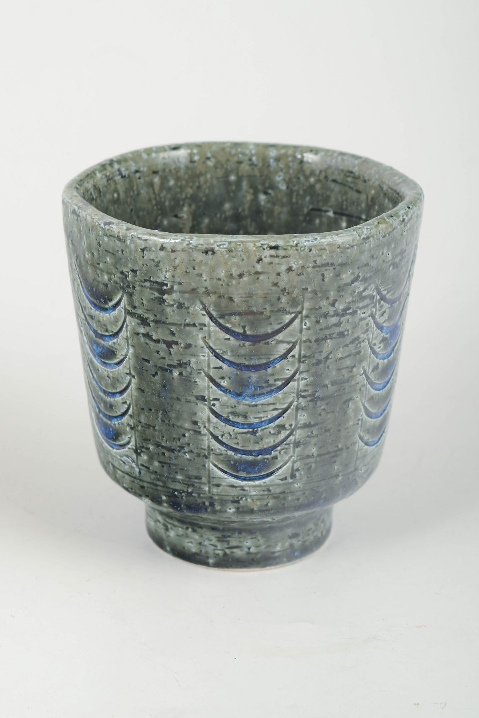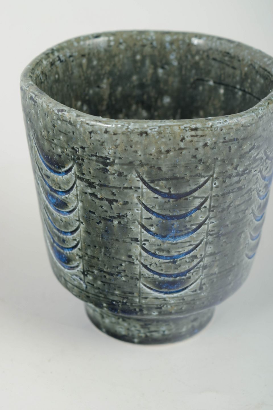 Annelise og Per Linnemann-Schmidt for Palshus – Vase, 1970’erne.Lille cylindrisk vase i stentøj med indskårne buemotiver i blå nuancer og karakteristisk Palshus askeglasur. Signeret.