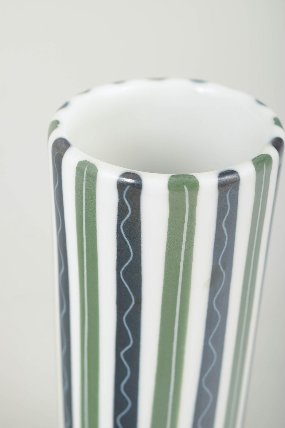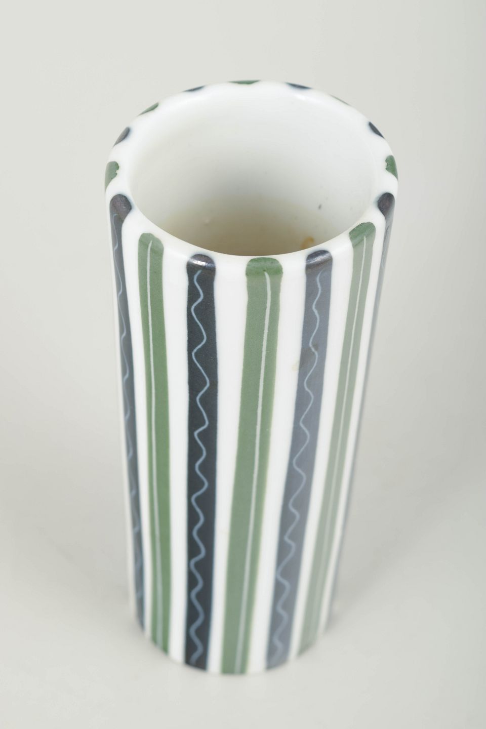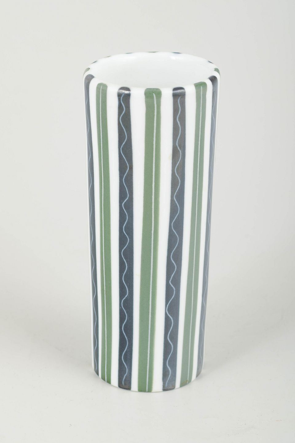 Cylinderformet vase i fajance/keramik med klassisk håndmalet stribedekor i grønne, grå og hvide nuancer.