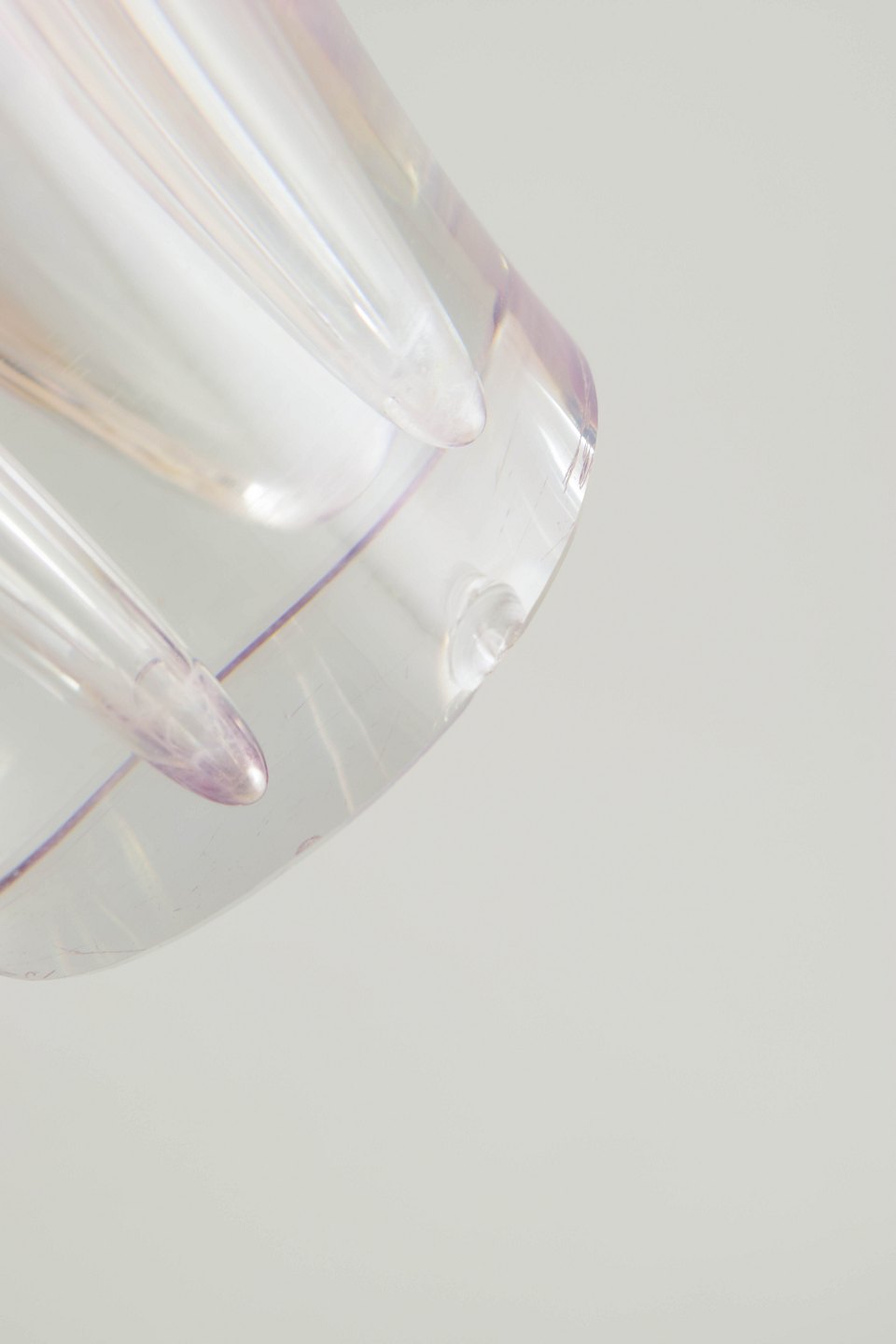 Imponerende og skulpturel Coquille-vase i klart glas med lag i dyb rosa, rubinrød og hvid. Mundblæst, høj og flammeformet silhuet — en af seriens mest monumentale variationer.