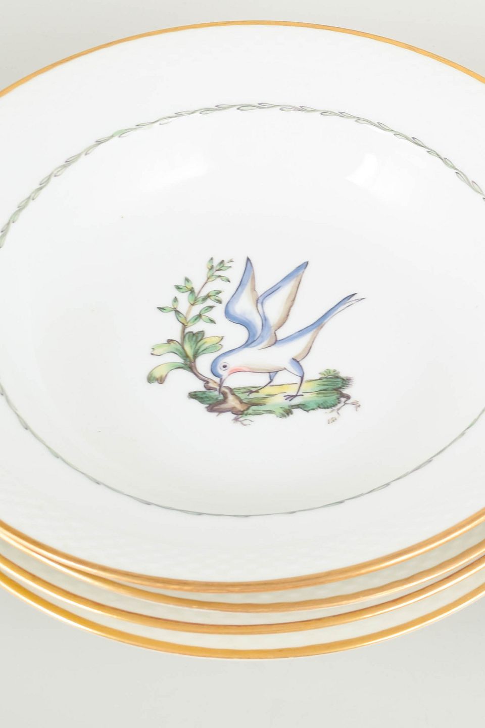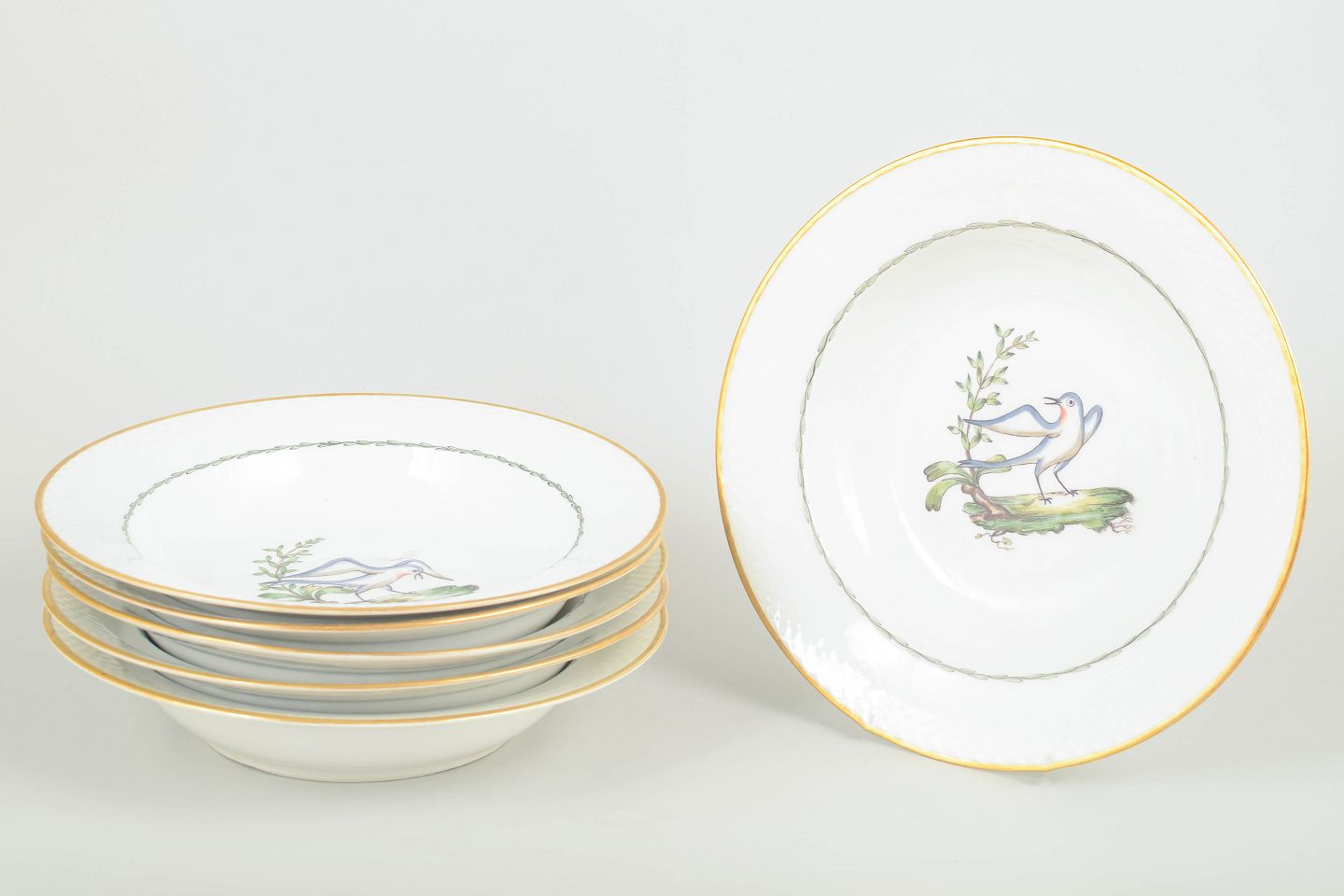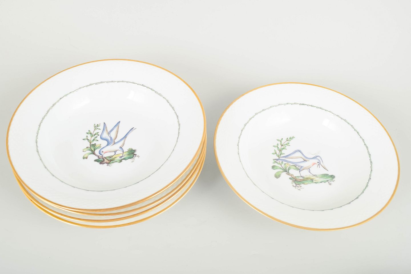 Royal Copenhagen – Sæt af fseks store dybe tallerkener, tidligt 1900-tal.Sjældne dybe tallerkener i porcelæn fra Royal Copenhagen med motiv af fugle og botaniske elementer (model 550/8107). Hver tallerken er kantet med guldrand og har et elegant, let riflet fletrelief langs kanten.