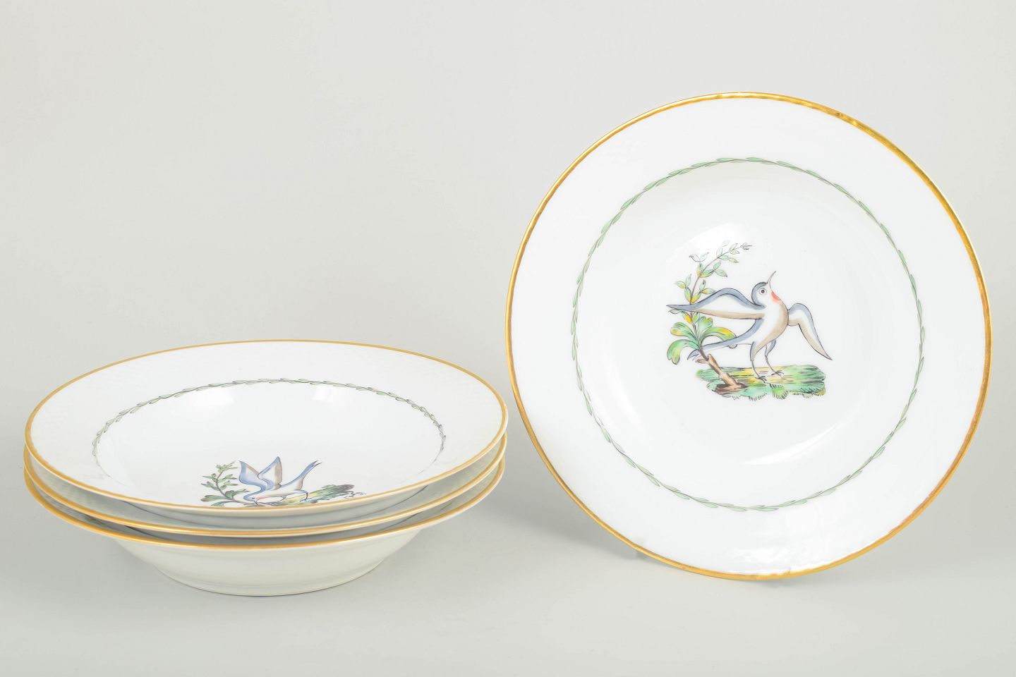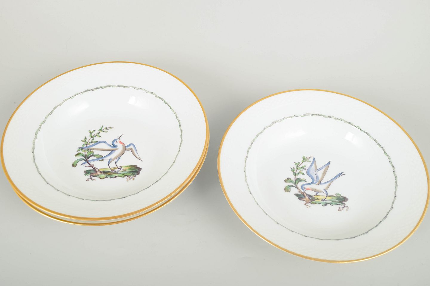 Royal Copenhagen – Sæt af fire store dybe tallerkener, tidligt 1900-tal.Sjældne dybe tallerkener i porcelæn fra Royal Copenhagen med motiv af fugle og botaniske elementer (model 550/8107). Hver tallerken er kantet med guldrand og har et elegant, let riflet fletrelief langs kanten.