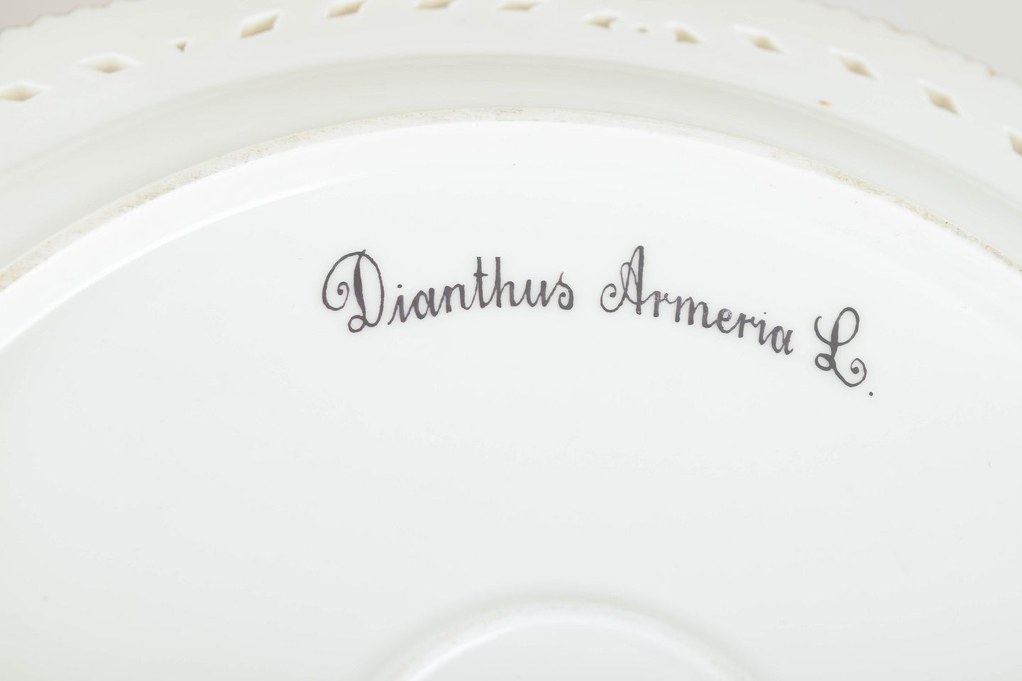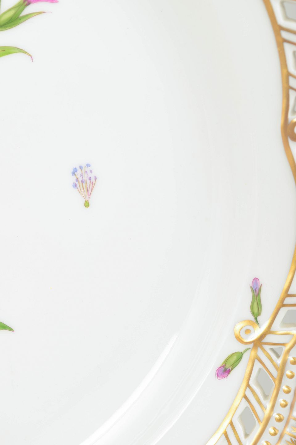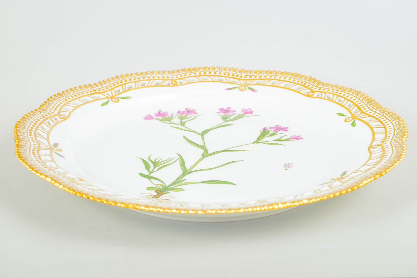 Meget stort Flora Danica-fad med åbent gennembrudt bort, rigt håndmalet med botanisk motiv og forgyldt dekoration.