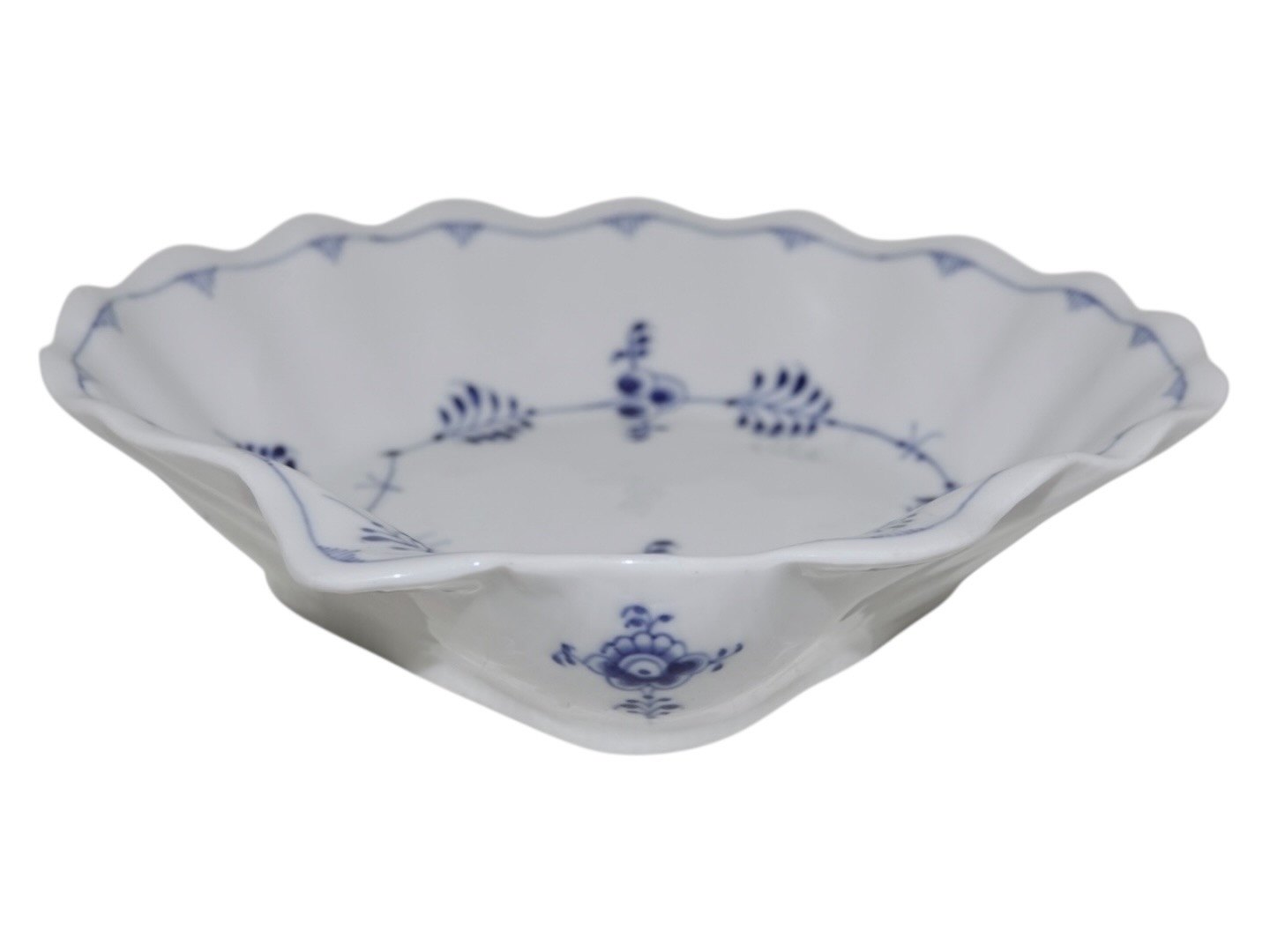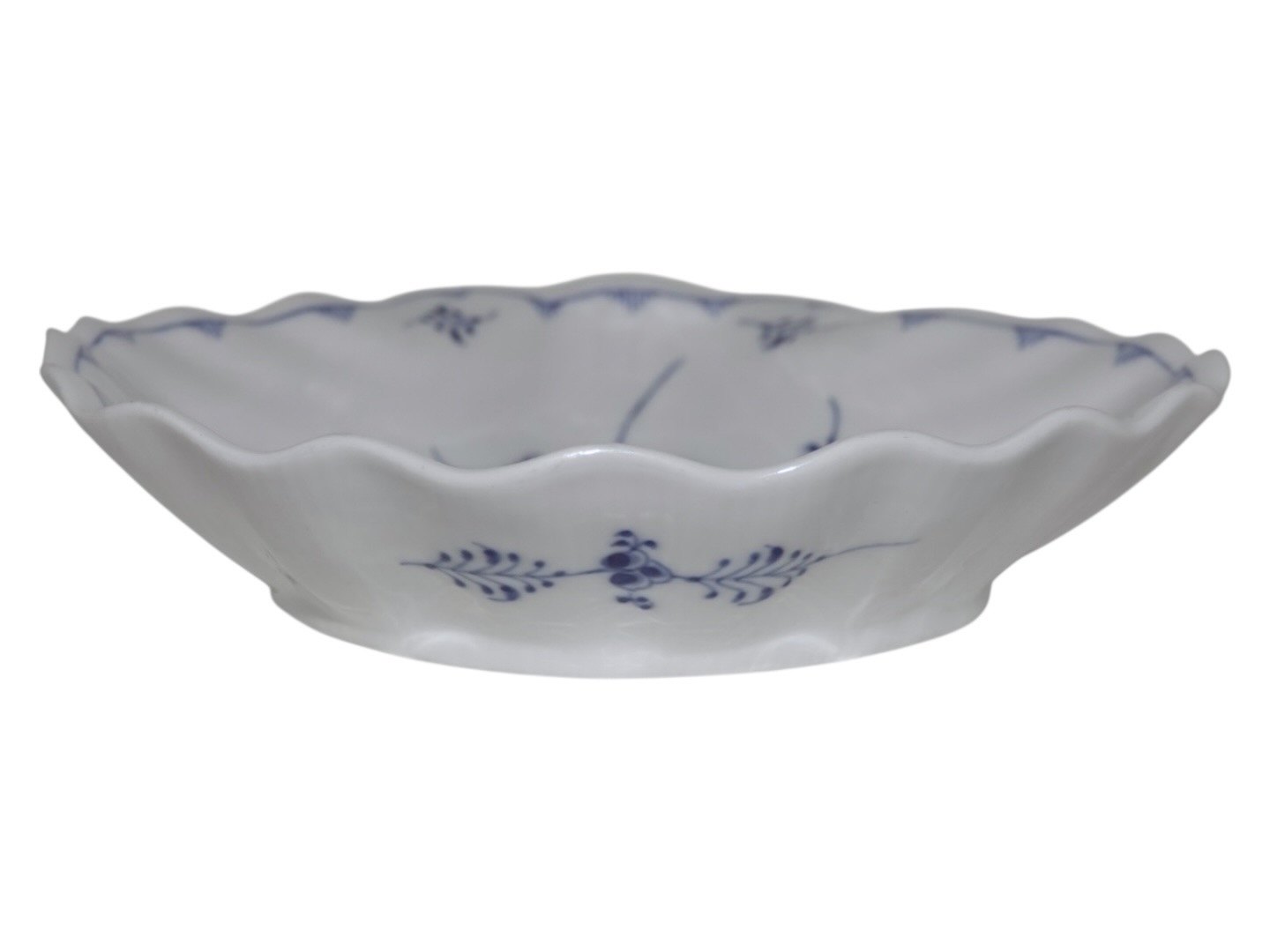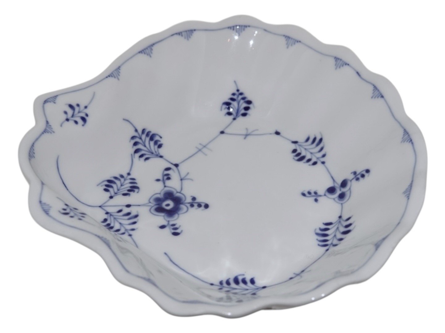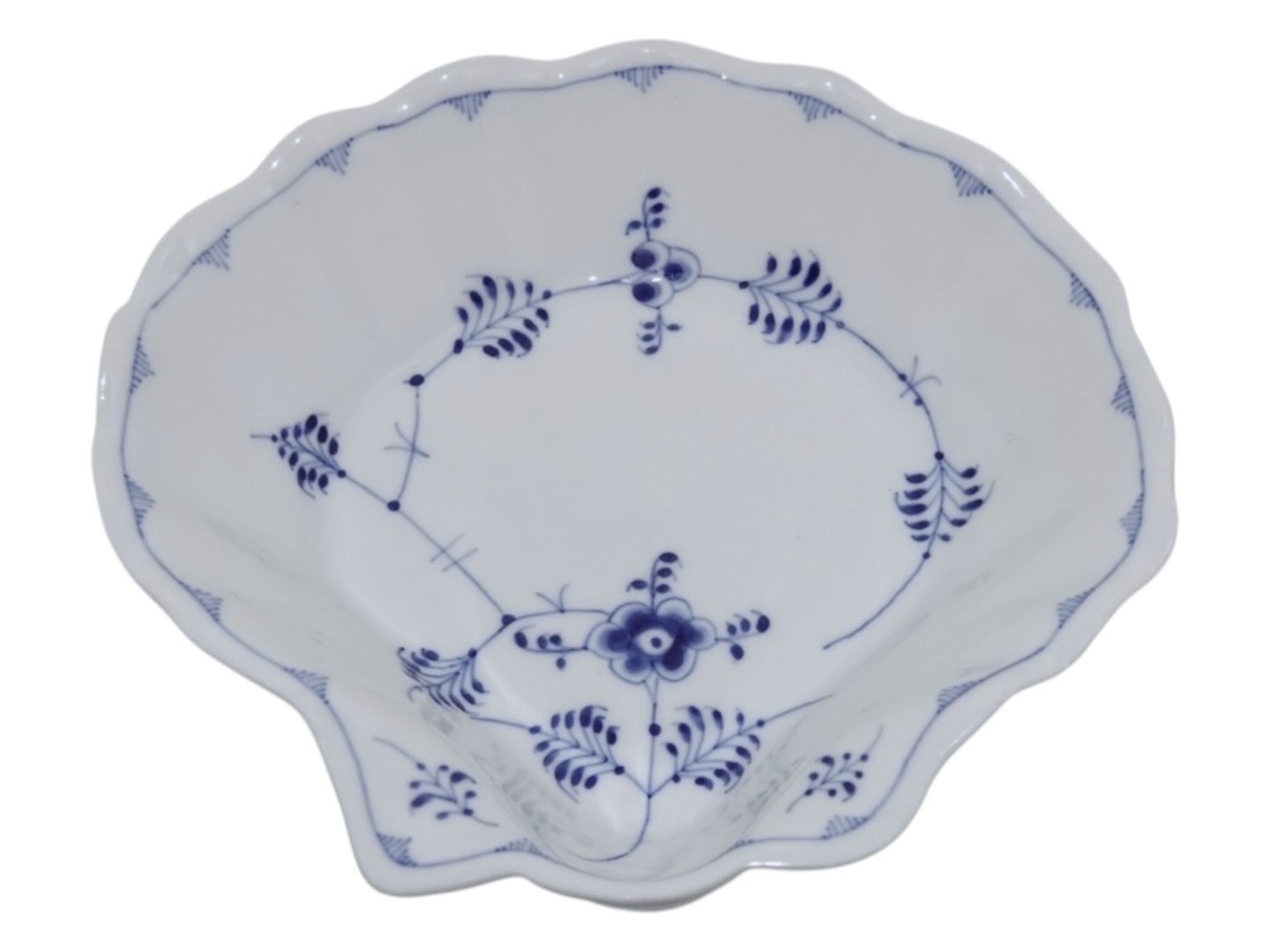 Royal Copenhagen Musselmalet Riflet, sjælden muslingeformet skål.Fabriksmærket viser, at denne er produceret mellem 1898 og 1923.