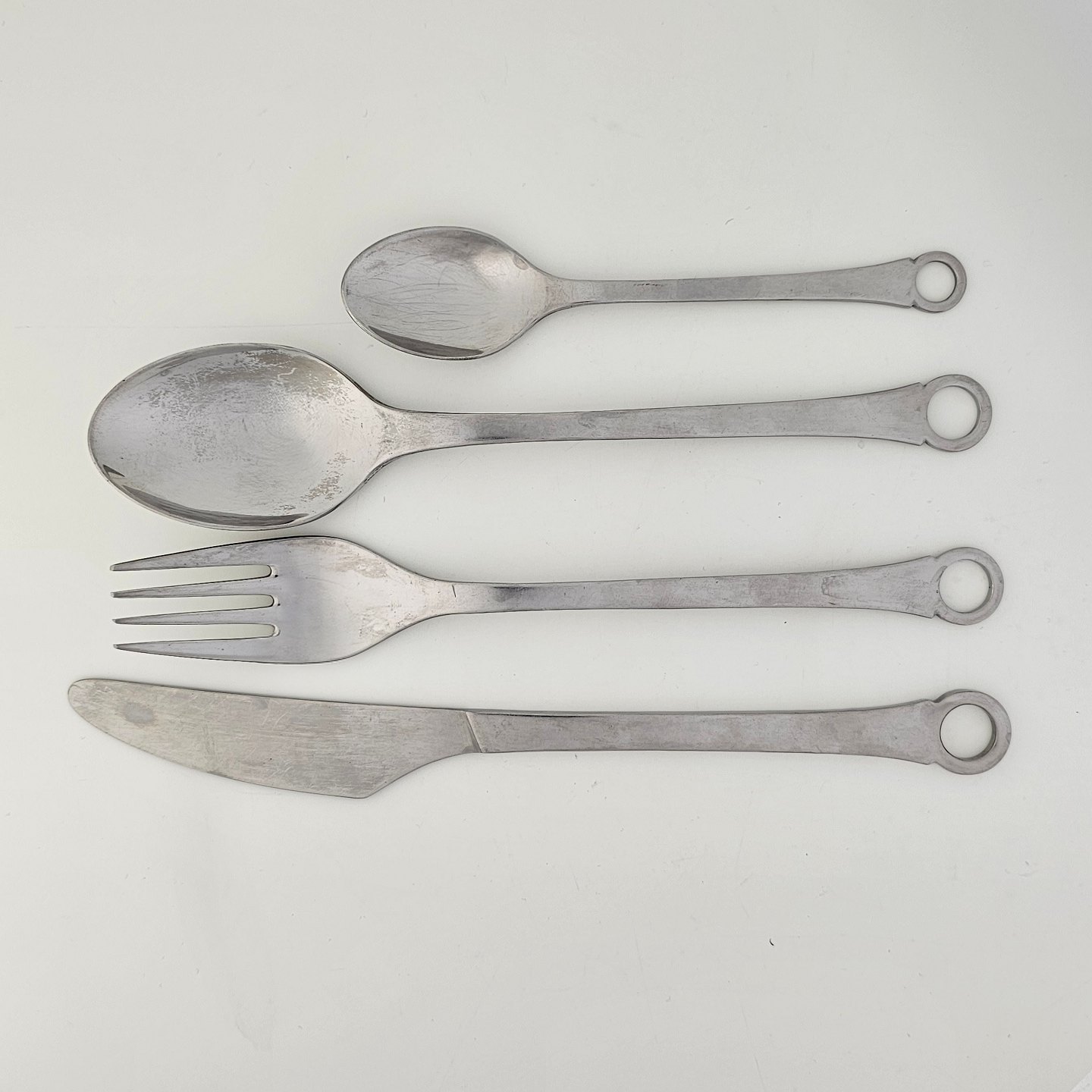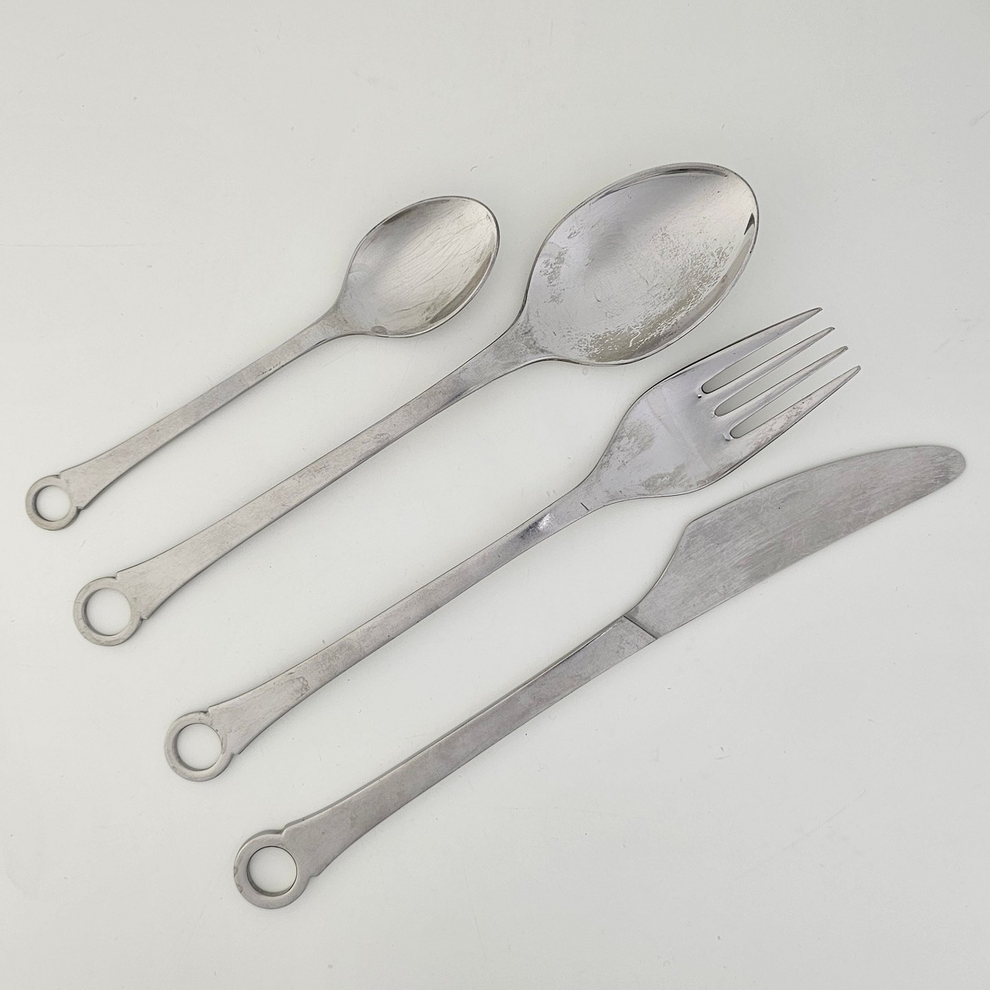 Bestik i rustfrit stål fra serien Pantry bestående af kniv, gaffel, spiseske og teskeFormgiver Henning Seidelin