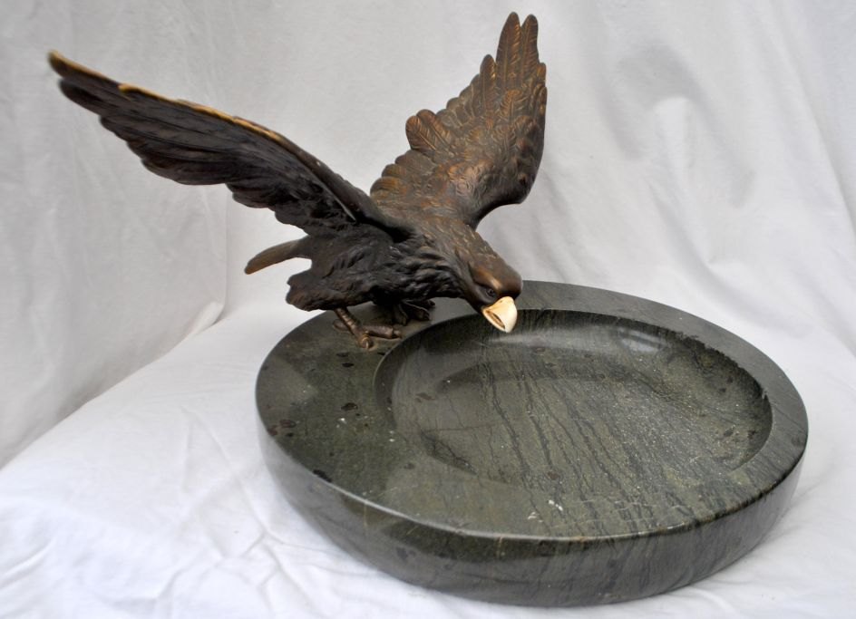 Großer französischer Bronzeadler auf einer Marmor schale, Jugendstil, um 1900. Adler mit ausgebreiteten Flügeln und Elfenbeinschnabel. Marmorplatte in Grün. Plattendurchmesser: 35 cm. Adler: B: 40 cm. H: 23 cm.