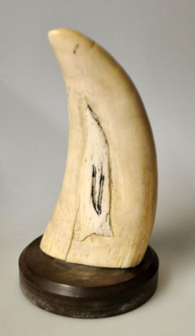Grönländischer Pottwalzahn auf Bakelitsockel. 19.–20. Jahrhundert. Eine Seite mit einem geschnitzten Vogel verziert. Höhe: 13,8 cm. Höhe mit Sockel: 16 cm.Bestellnummer: 28612