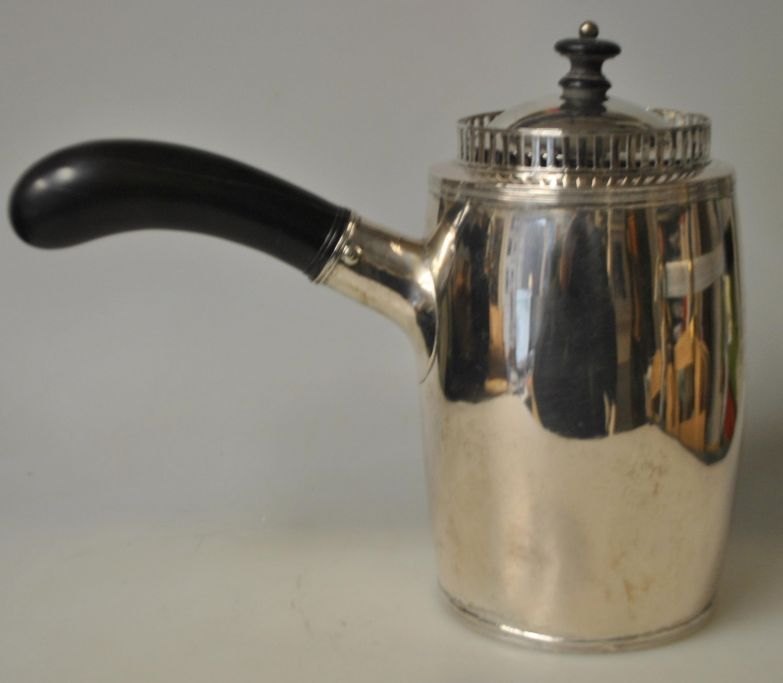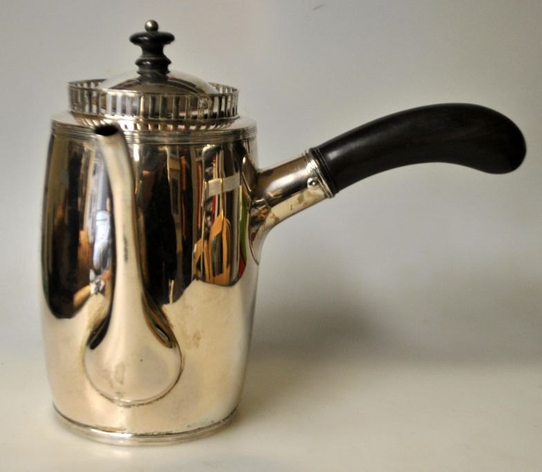 Martin Hinrich Petersen (1756–1824), Haderslev, Dänemark: Stjert Empire Kaffeekanne aus Silber. Glatter Korpus. Henkel und Knauf aus Ebenholz. Meister- und Ortsmarke. Seitliche Kartusche: AWH: 21 cm. Gewicht: 579 Gramm.Auch auf der Unterseite befinden sich Gravuren von verschiedenen Vorbesitzern.