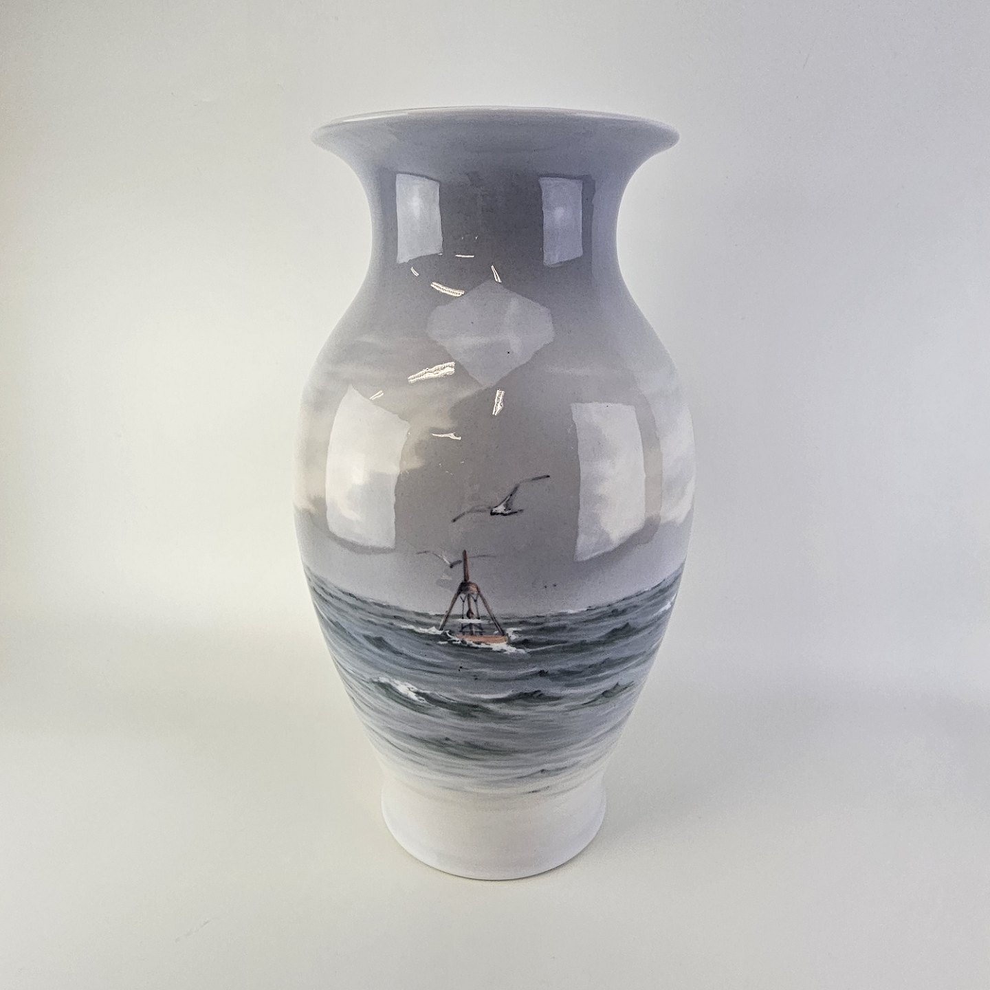 Vase i kongeligt porcelæn med motiv af fiskekuttere til søsNr. 2815/2984