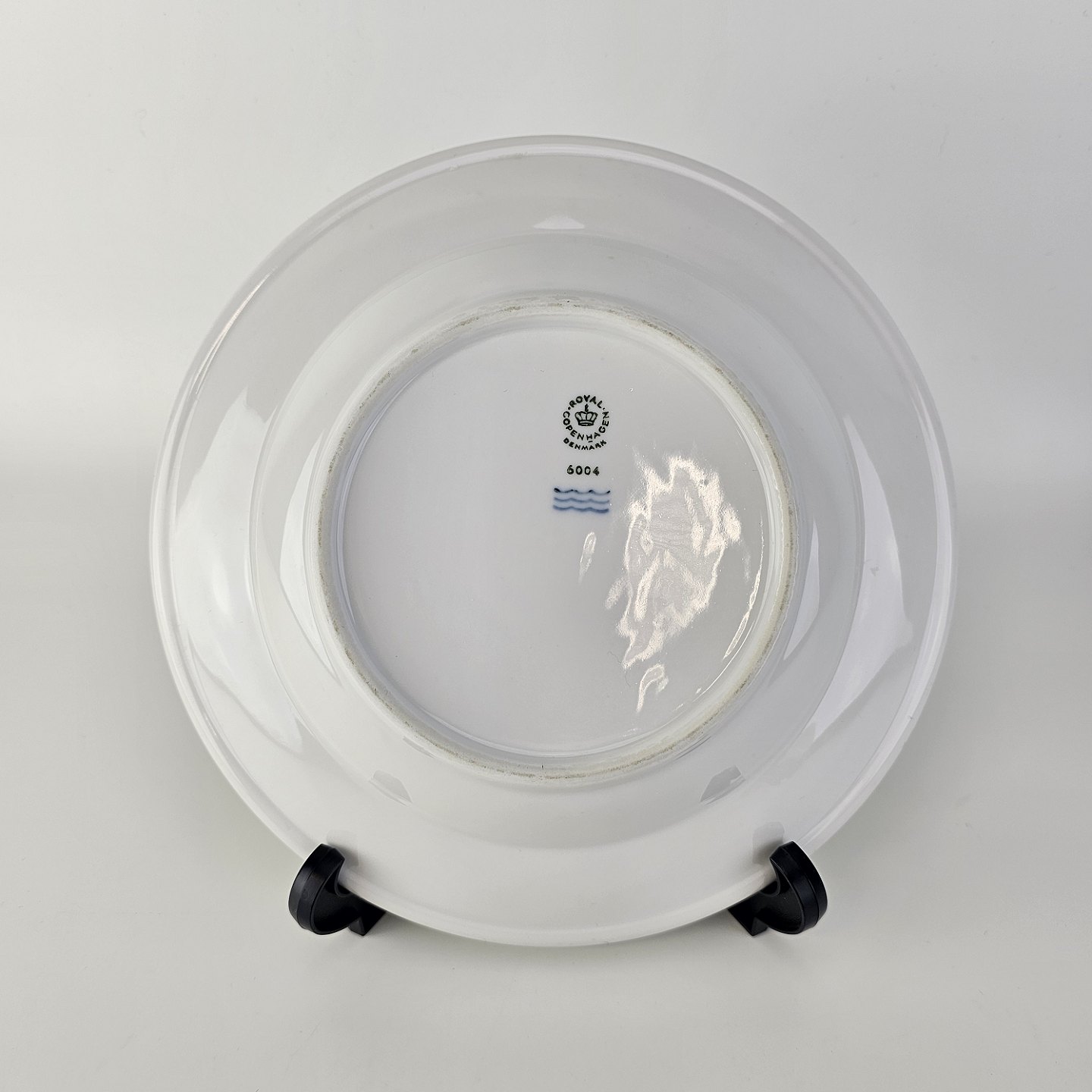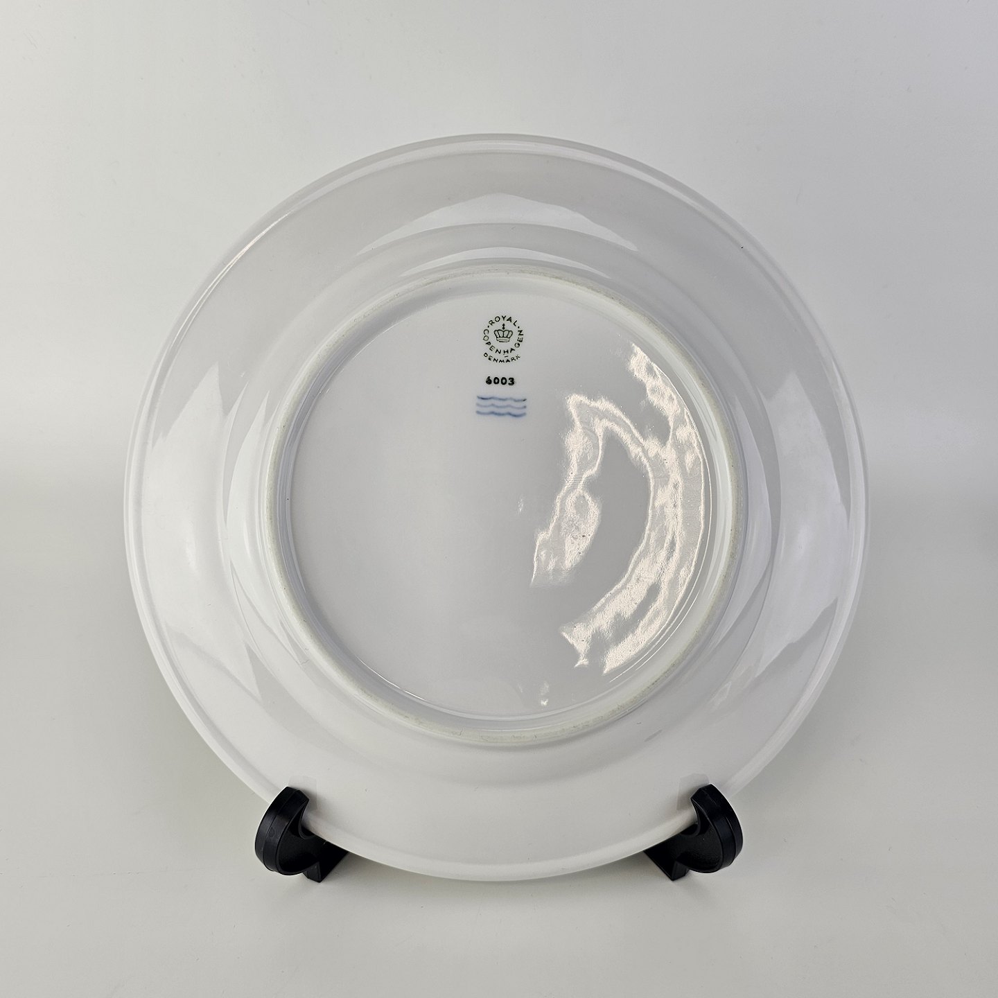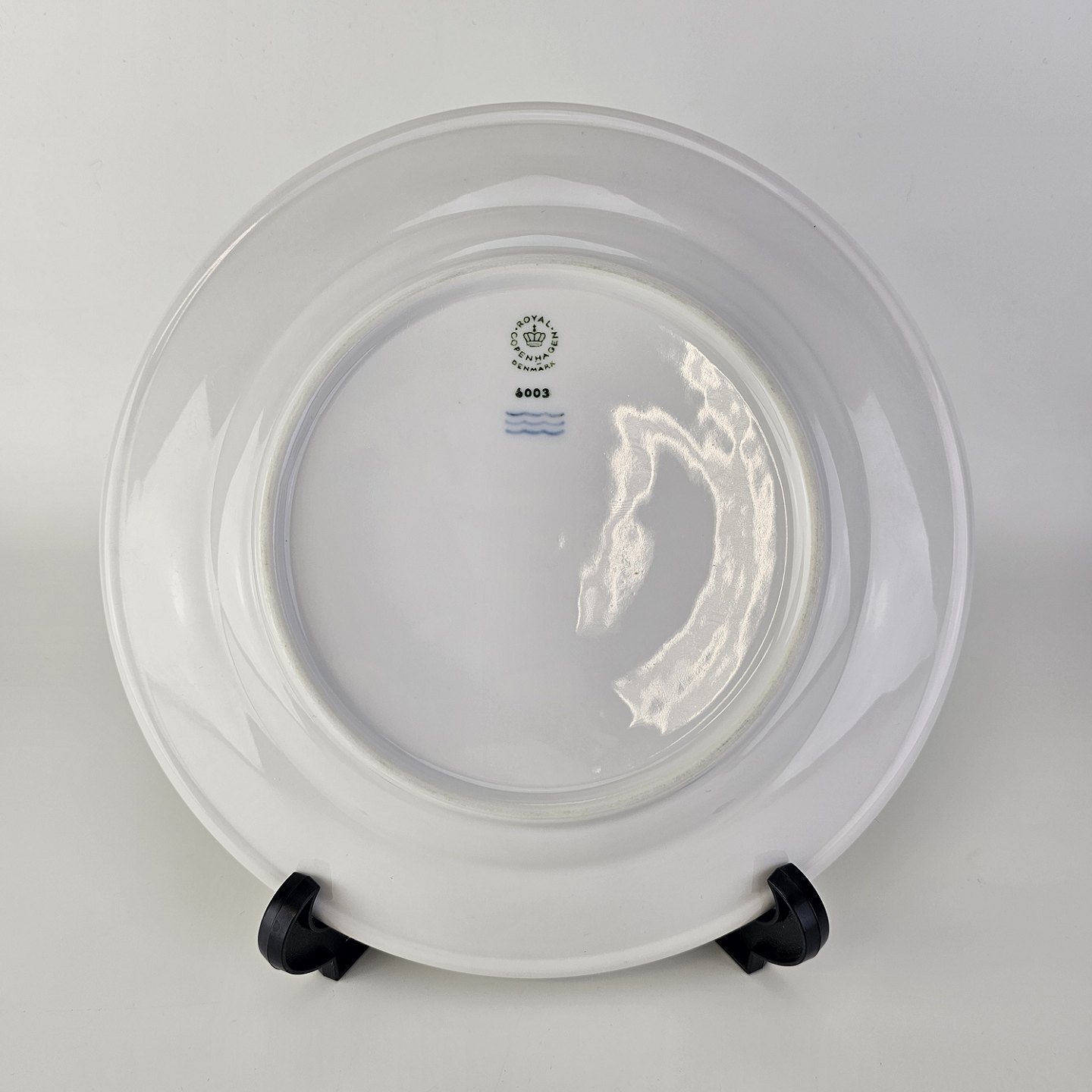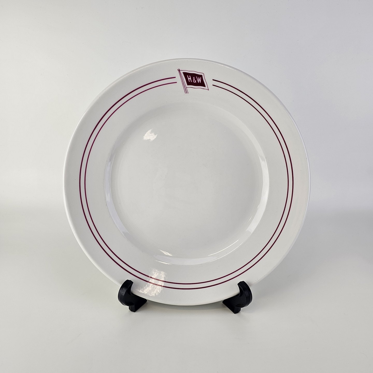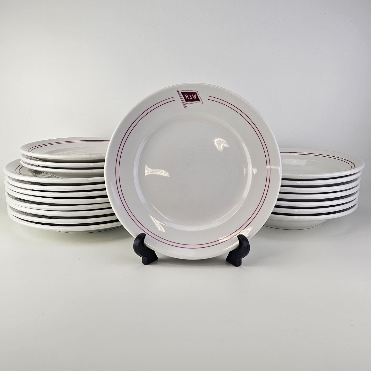 Et samlet sæt hotelporcelæn med flade middagstallerkener, flade frokosttallerkener og dybe tallerkener i kongeligt porcelæn dekoreret med røde streger og logoet for Holm & Wonsilds rederiProducent Royal Copenhagen