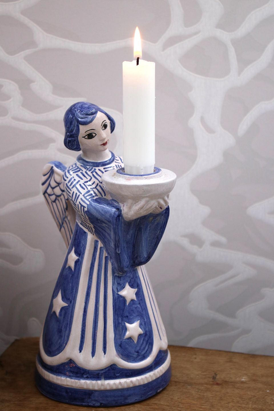 L. Hjorth keramik sjælden stor engel med blå / hvid glasurder holder et almindelig størrelse stearinlys. Højde: 22cm.