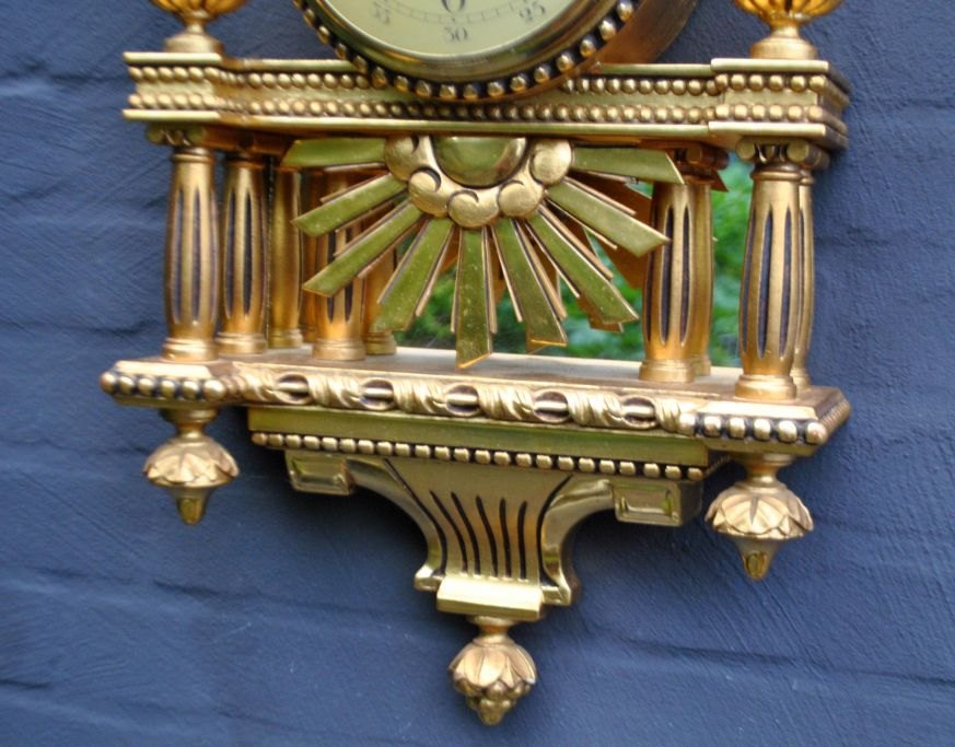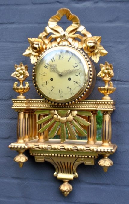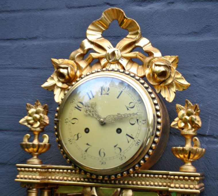 Schwedische vergoldete Wanduhr, 20. Jahrhundert. Höhe: 60 cm. Breite: 34 cm. Zifferblatt mit arabischen Ziffern.Bestellnummer: 28475