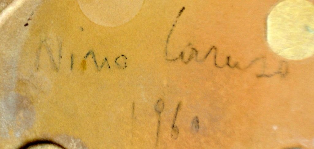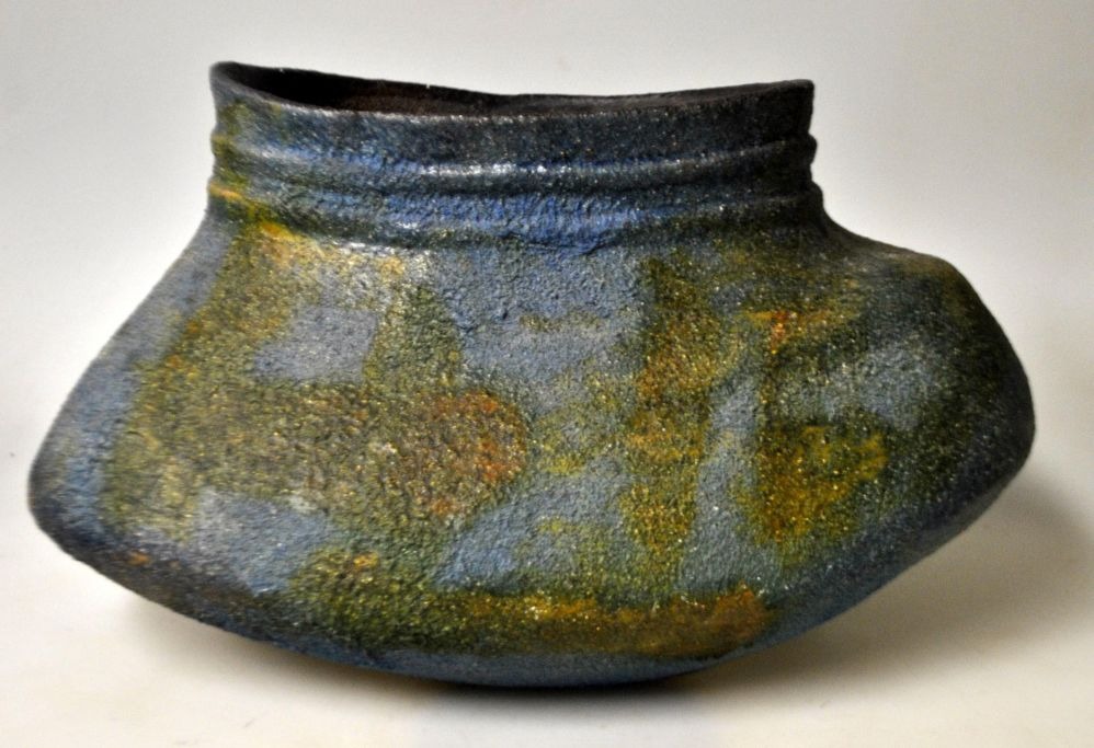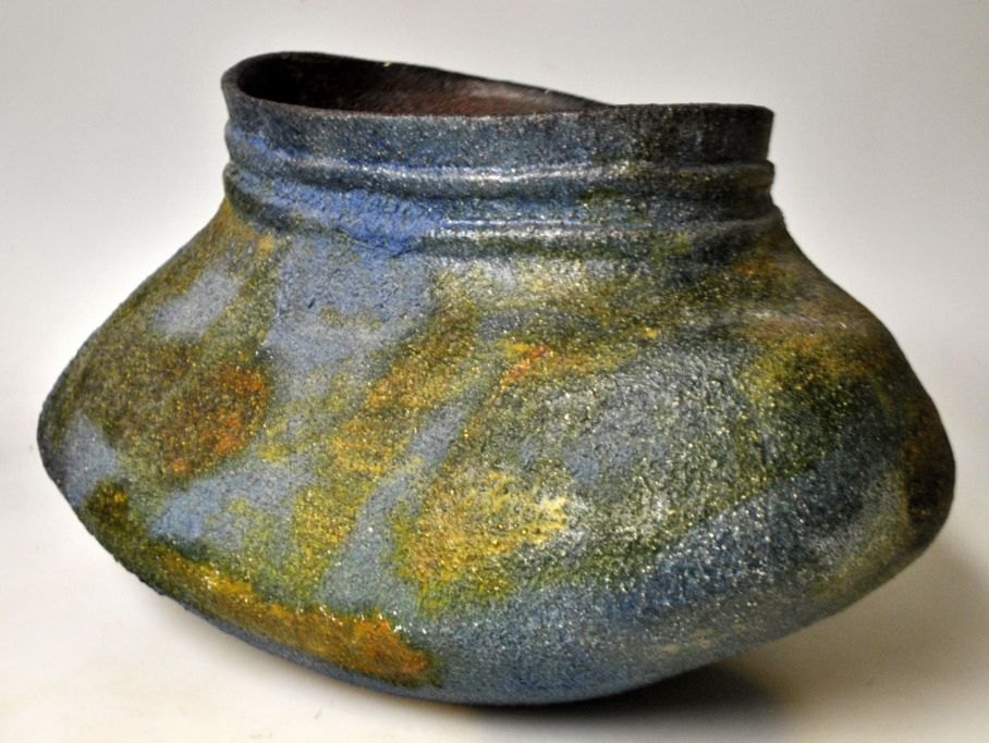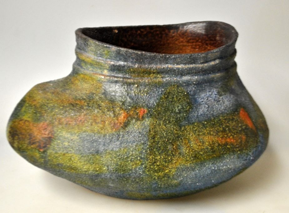 Caruso, Nino (1928–2017), Italien: Große Tischschale. Unikat. Roter Ton mit Struktur. Glasuren in Grün, Rot und Blau. Signiert: Nino Caruso 1960. Höhe: 14 cm. Länge: 28 cm.Bestellnummer: 28661