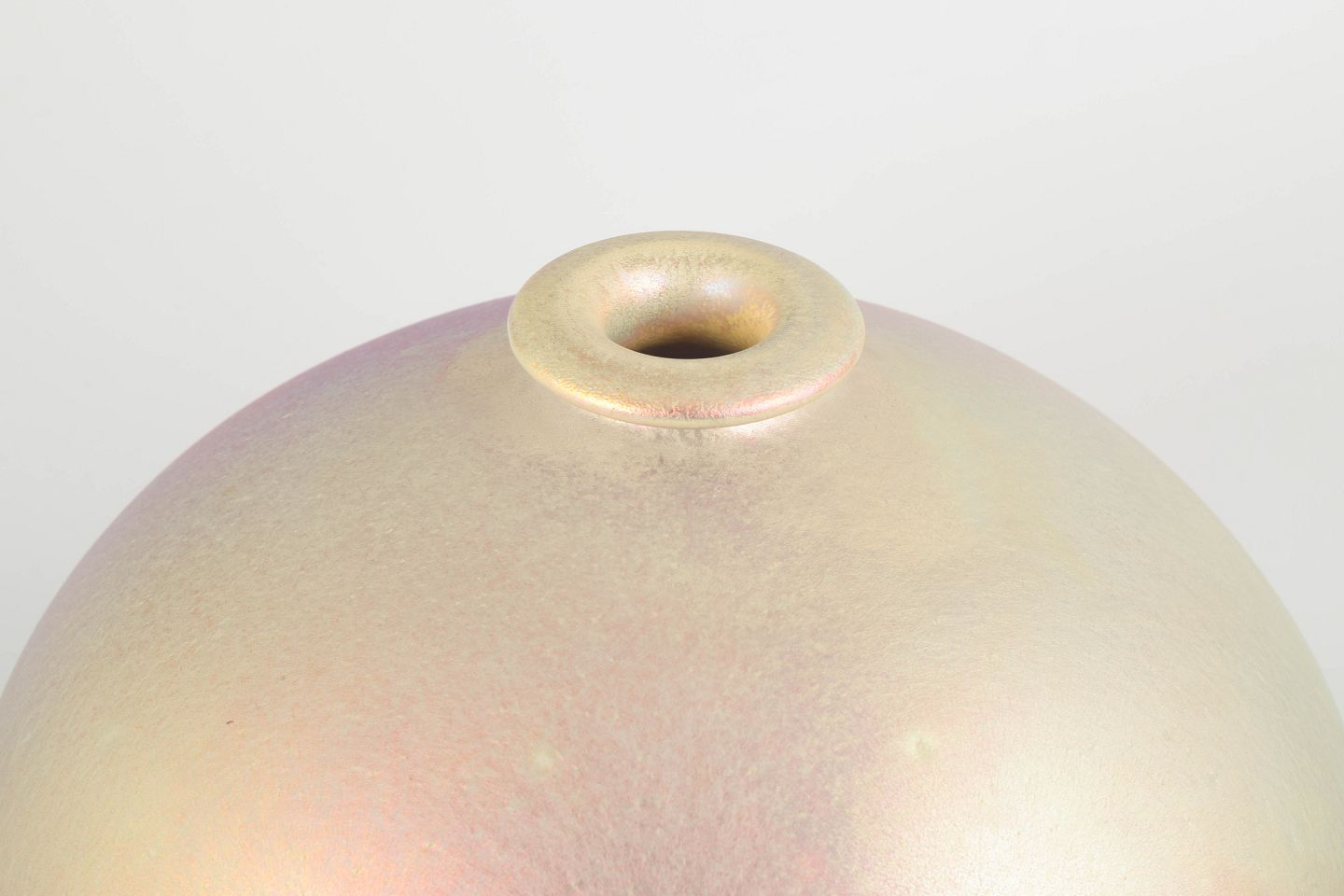 Håndlavet, monumentalt formet vase i keramik med iriserende, perlemorsskinnende overflade i bløde rosa- og guldtoner. Den sfæriske form og den lille, let markerede hals giver vasen en skulpturel og harmonisk fremtoning – karakteristisk for Mobachs håndværksmæssige tradition.