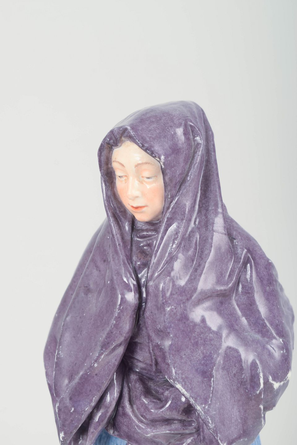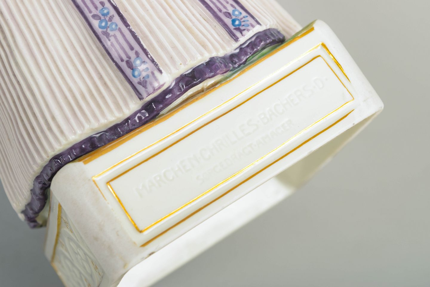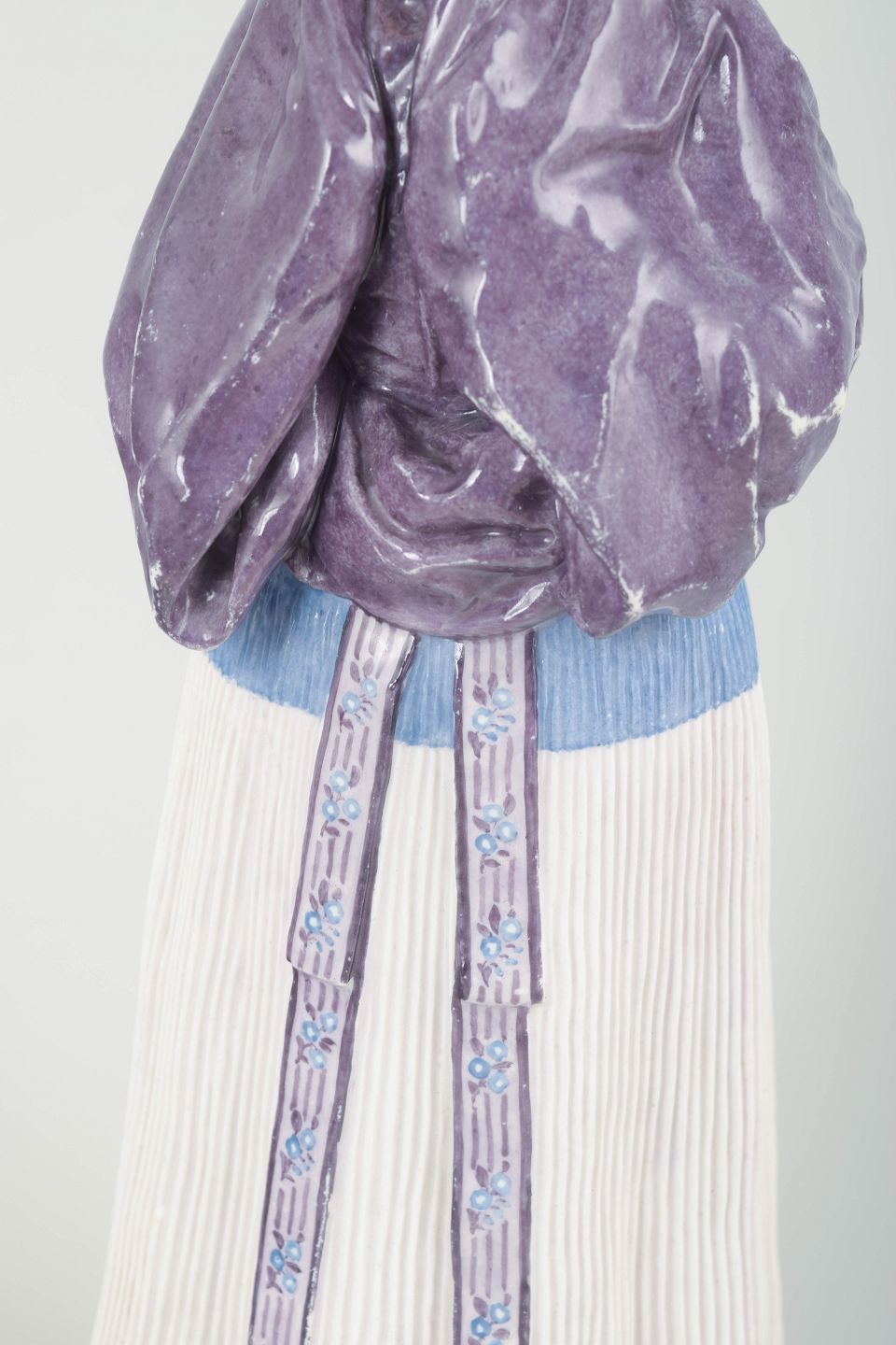 Håndmalet figur forestillende en kvinde i traditionel folkedragt, stående på rektangulær sokkel dekoreret i overglasur. Undersiden med indskriften “MARCHEN CHRILLES BACHERS” samt Juliane Marie-mærke.