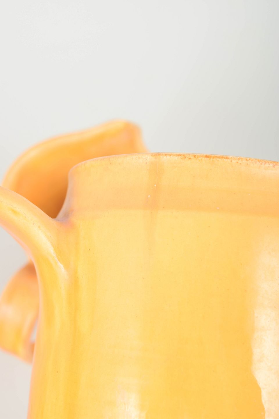 To store hånddrejede keramik-kander i Kählers karakteristiske gul-orange glasur fra 1930’erne. Begge med markante svungne hanke og blød cylindrisk form. Klassiske brugskrukker fra perioden.