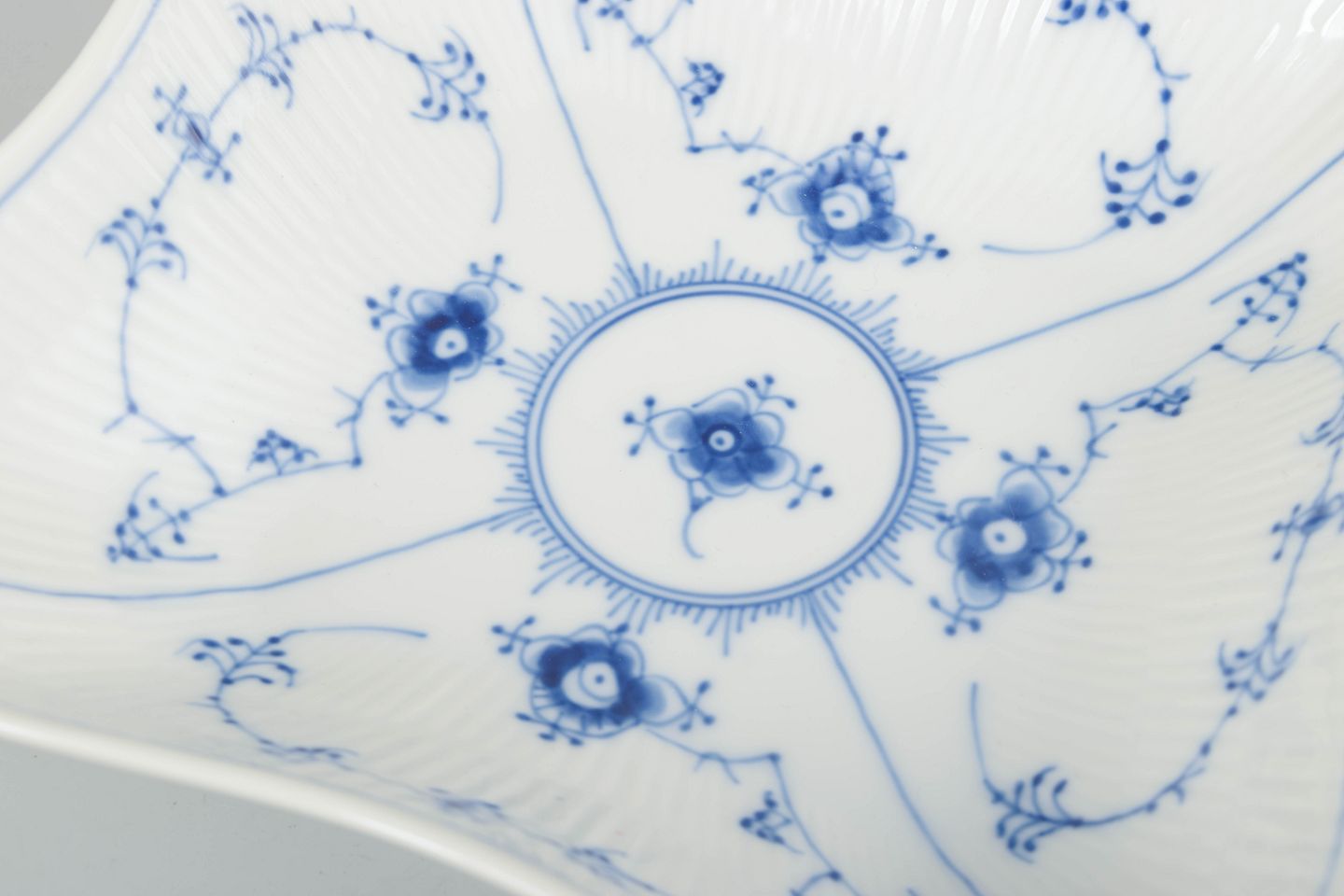 Musselmalet riflet blev lanceret i 1775 og er Royal Copenhagens mest ikoniske stel. Hver del håndmales af specialuddannede porcelænsmalere, hvilket sikrer den karakteristiske koboltblå farve og variation i penselstrøg, der gør hvert stykke unikt.