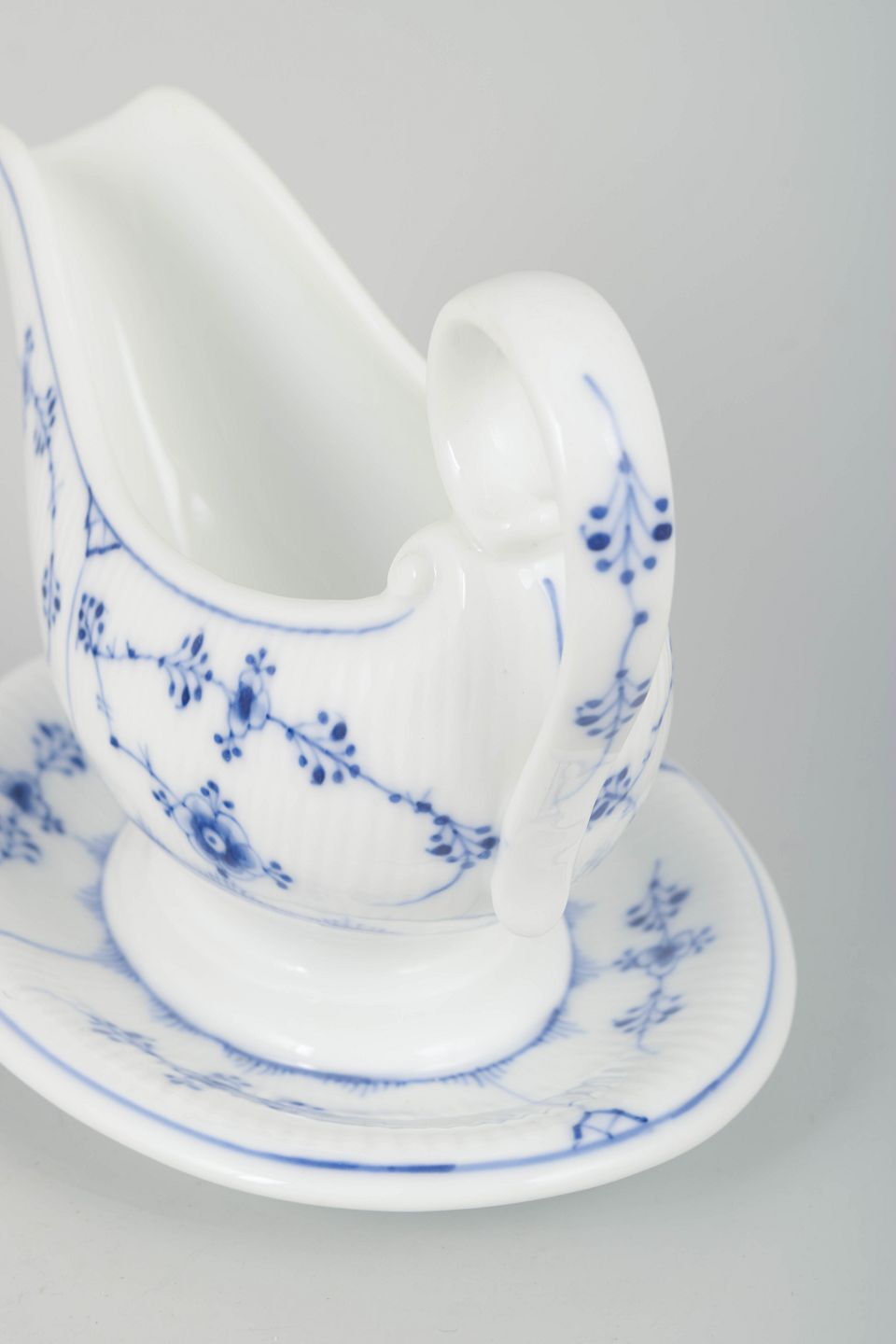 Med separat underfad, elegant svungen hank og håndmalet koboltblå dekoration på riflet korpus.