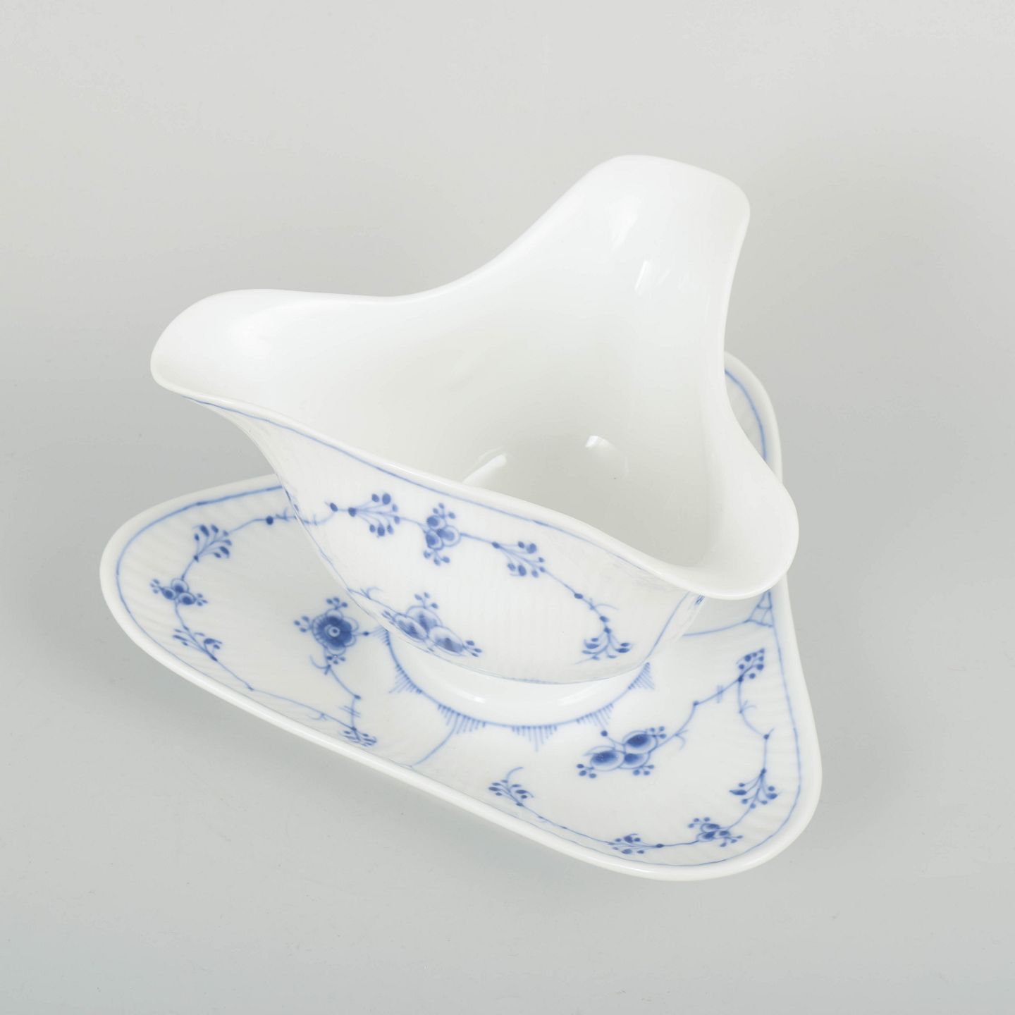 Smuk og klassisk sauceskål i musselmalet porcelæn. Formen er organisk svunget med integreret underfad, dekoreret med håndmalet koboltblåt blomster på riflet korpus.