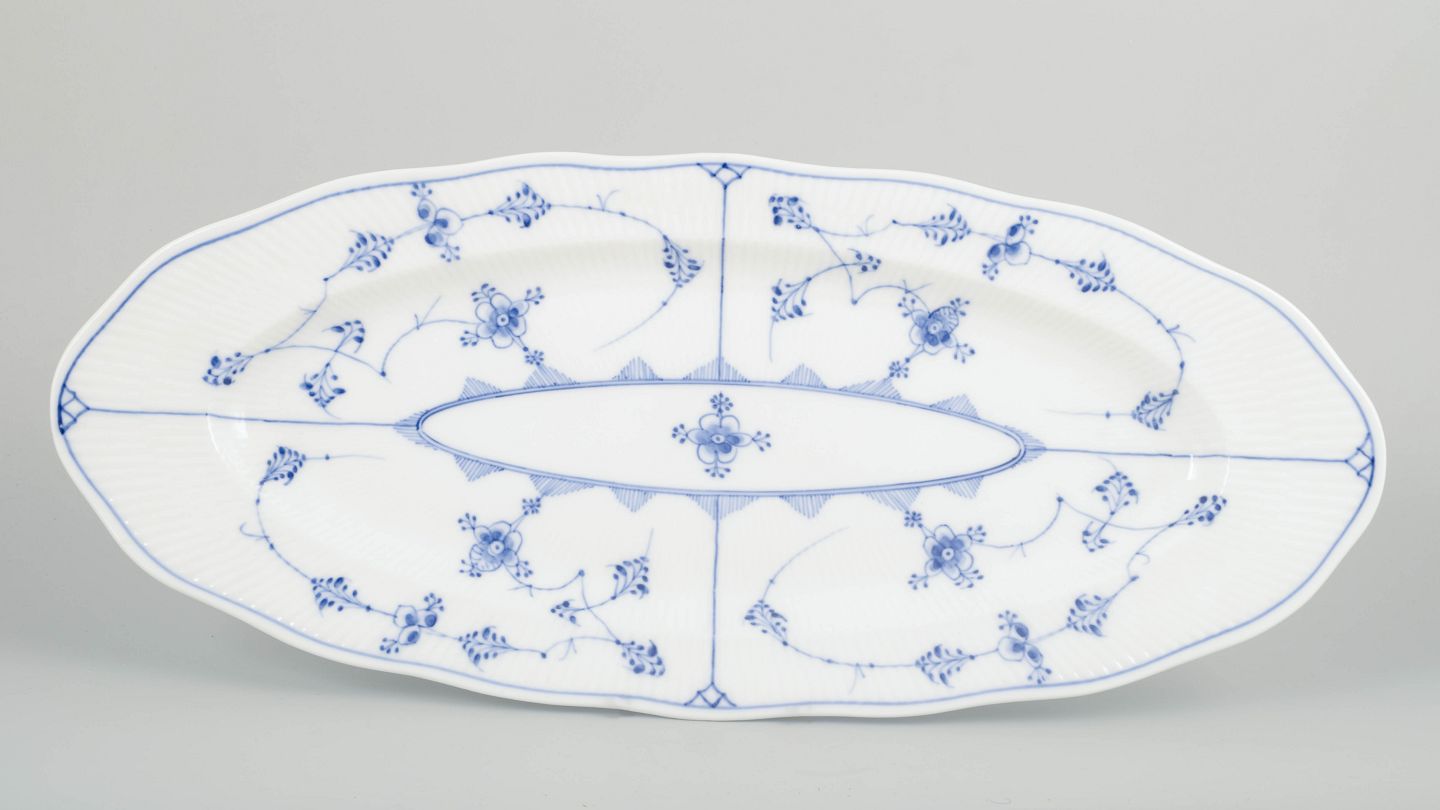 Stort og elegant fiskefad i klassisk musselmalet riflet porcelæn med håndmalet blå dekoration og riflet korpus. Den aflange form og det rige mønster gør fadet til et markant og dekorativt serveringsstykke fra begyndelsen af det 20. århundrede.