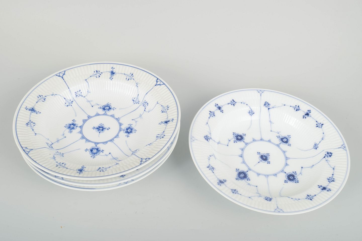 Sæt á fire dybe tallerkener i klassisk musselmalet porcelæn med håndmalet blå dekoration og riflet korpus.