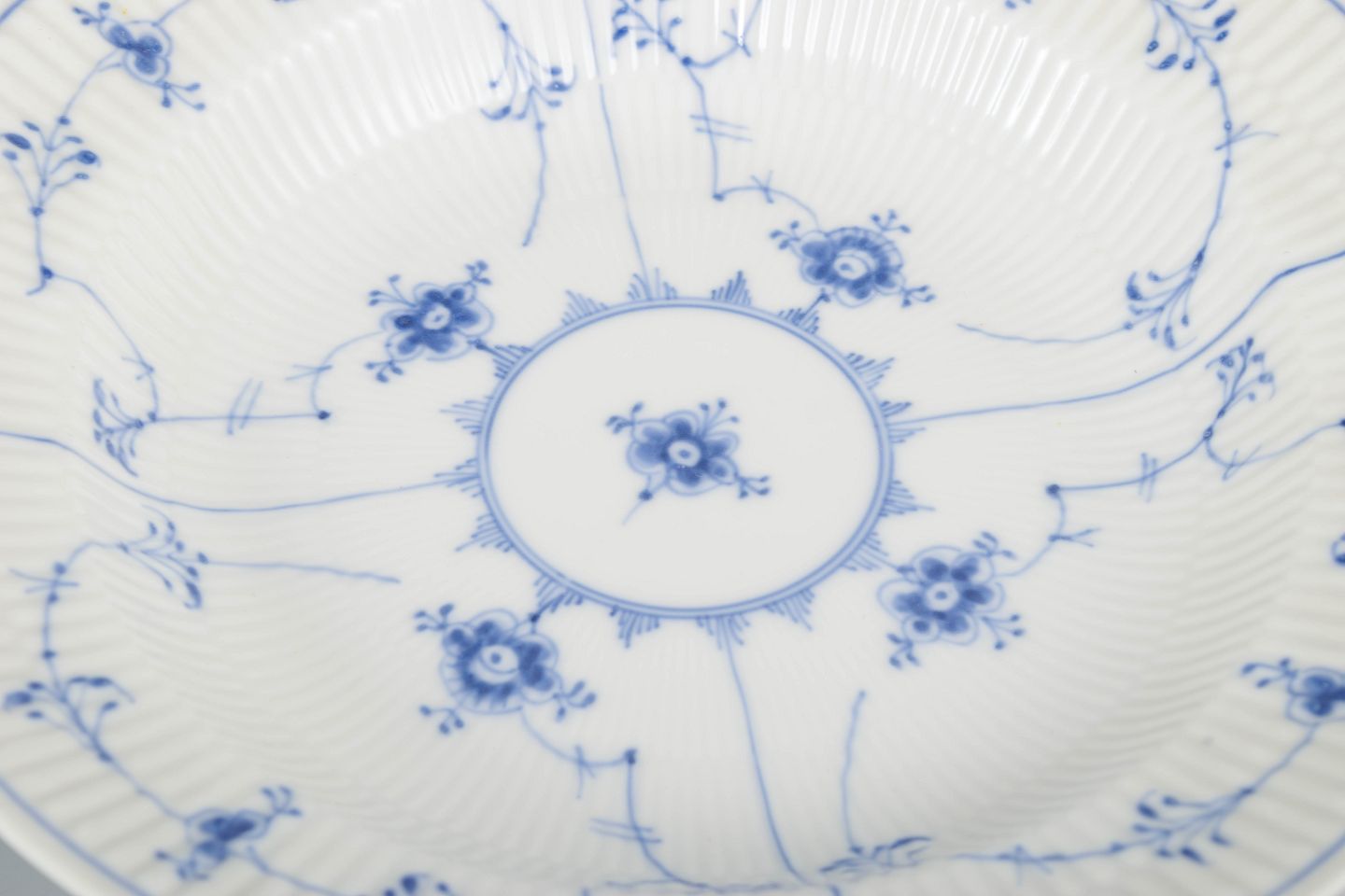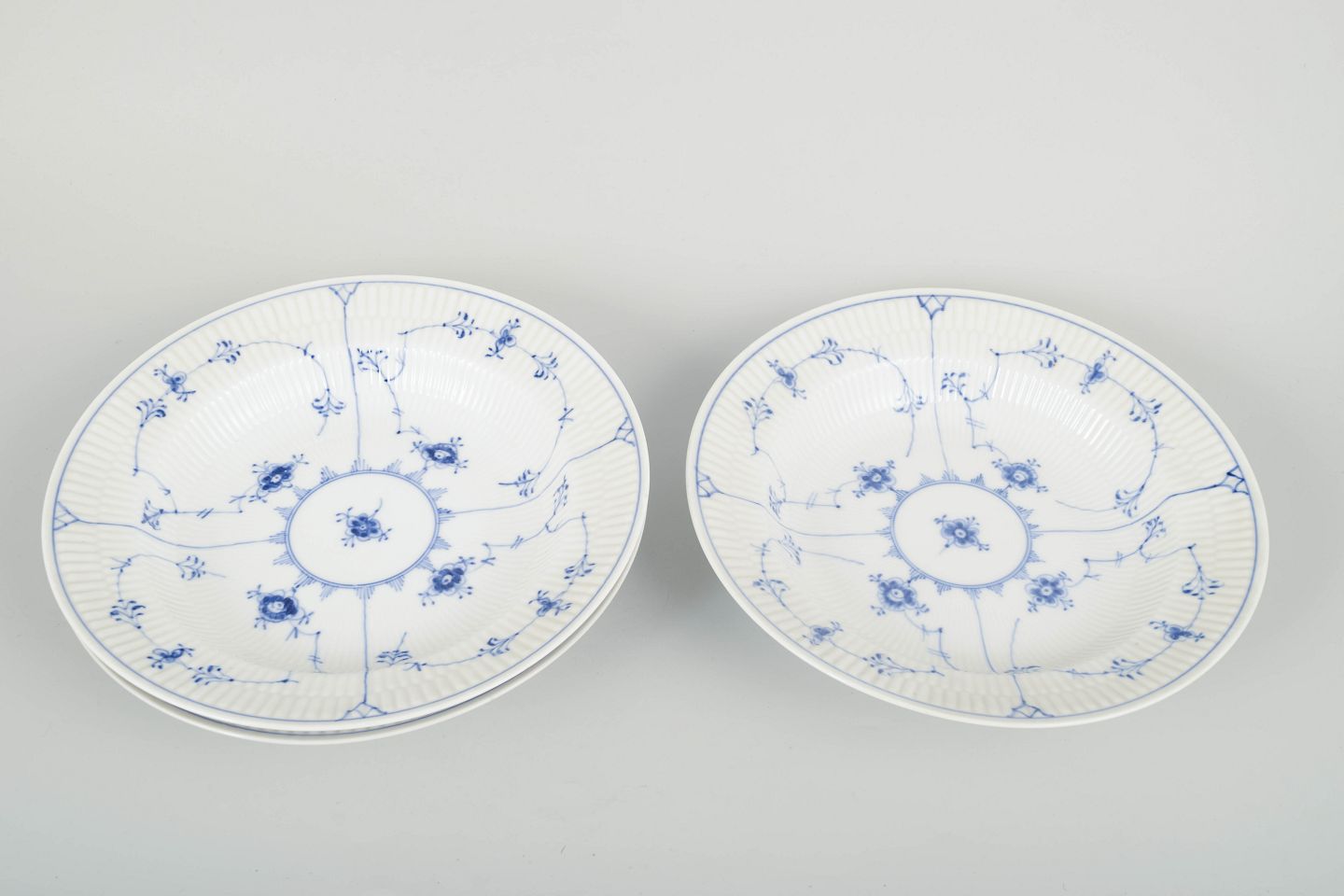 Sæt á tre dybe tallerkener i klassisk Musselmalet porcelæn med håndmalet blå dekoration og riflet korpus. Elegant og tidstypisk udførelse fra begyndelsen af det 20. århundrede.