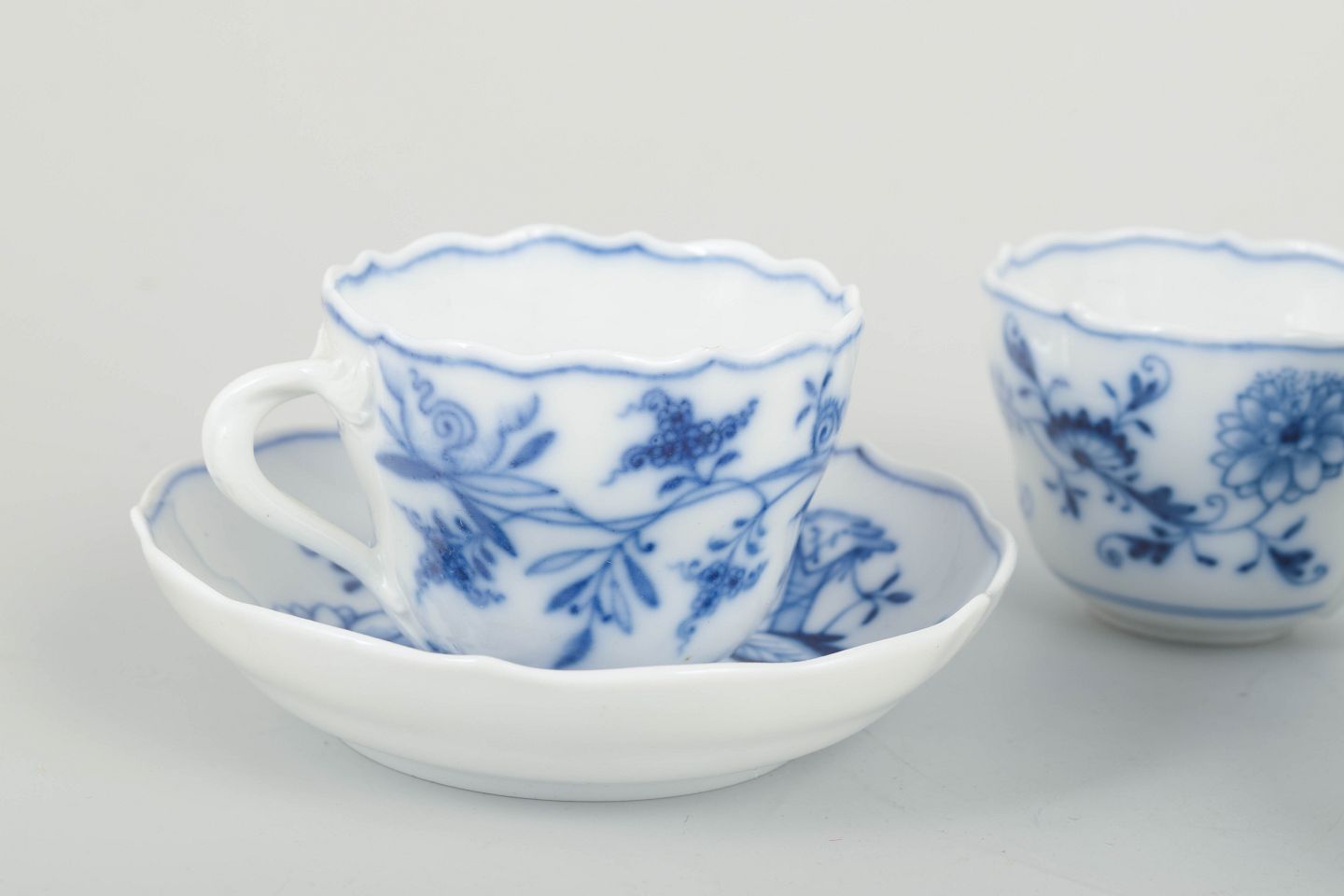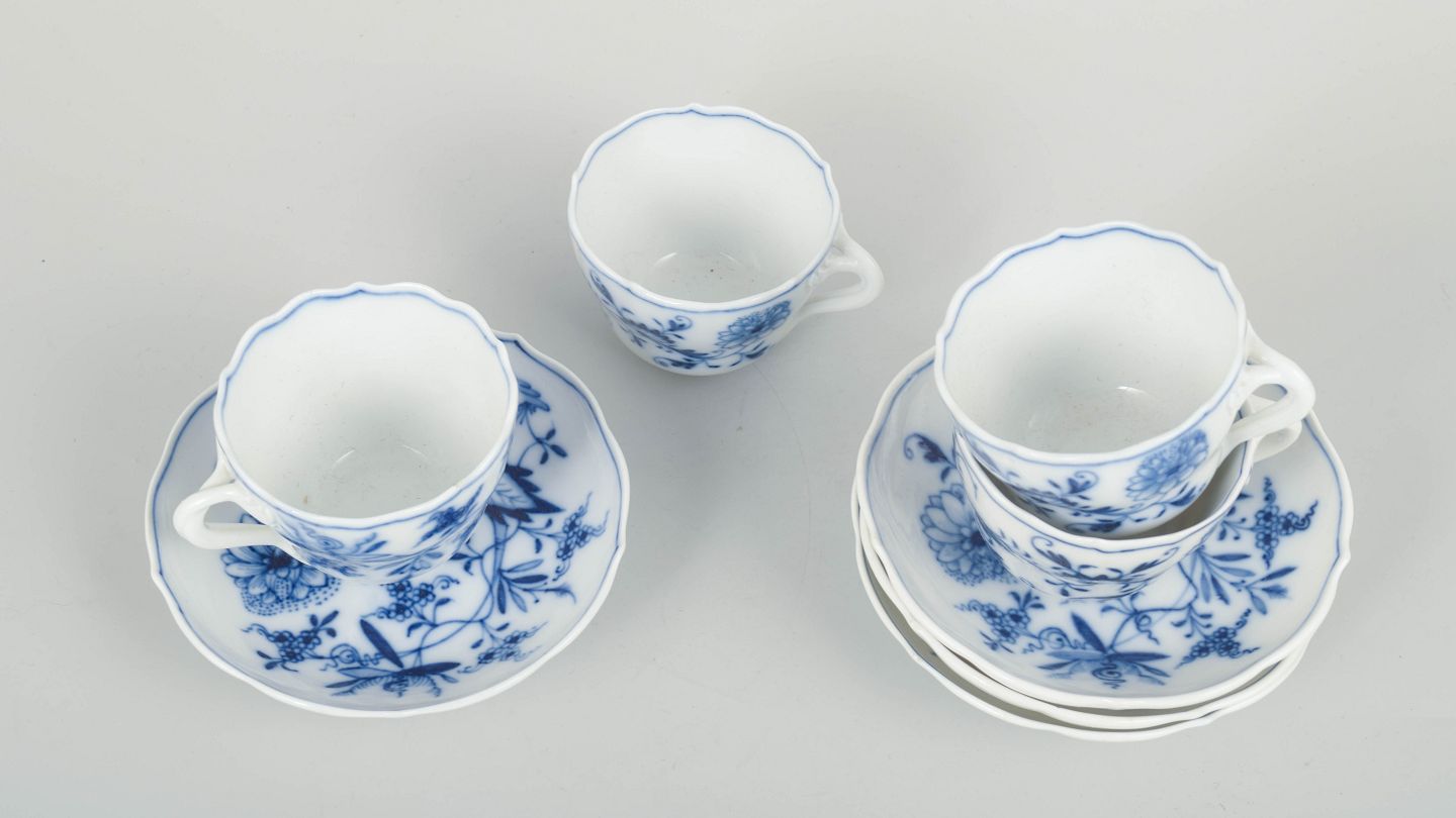 Meissen løgmønstretSæt med fire mokkakopper med tilhørende underkopper, sent 1800-tallet.
