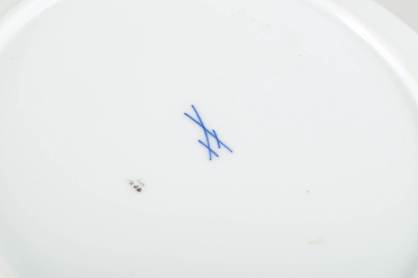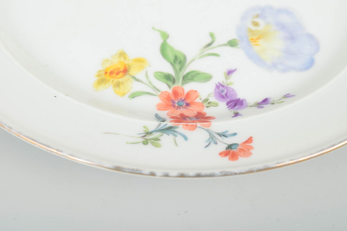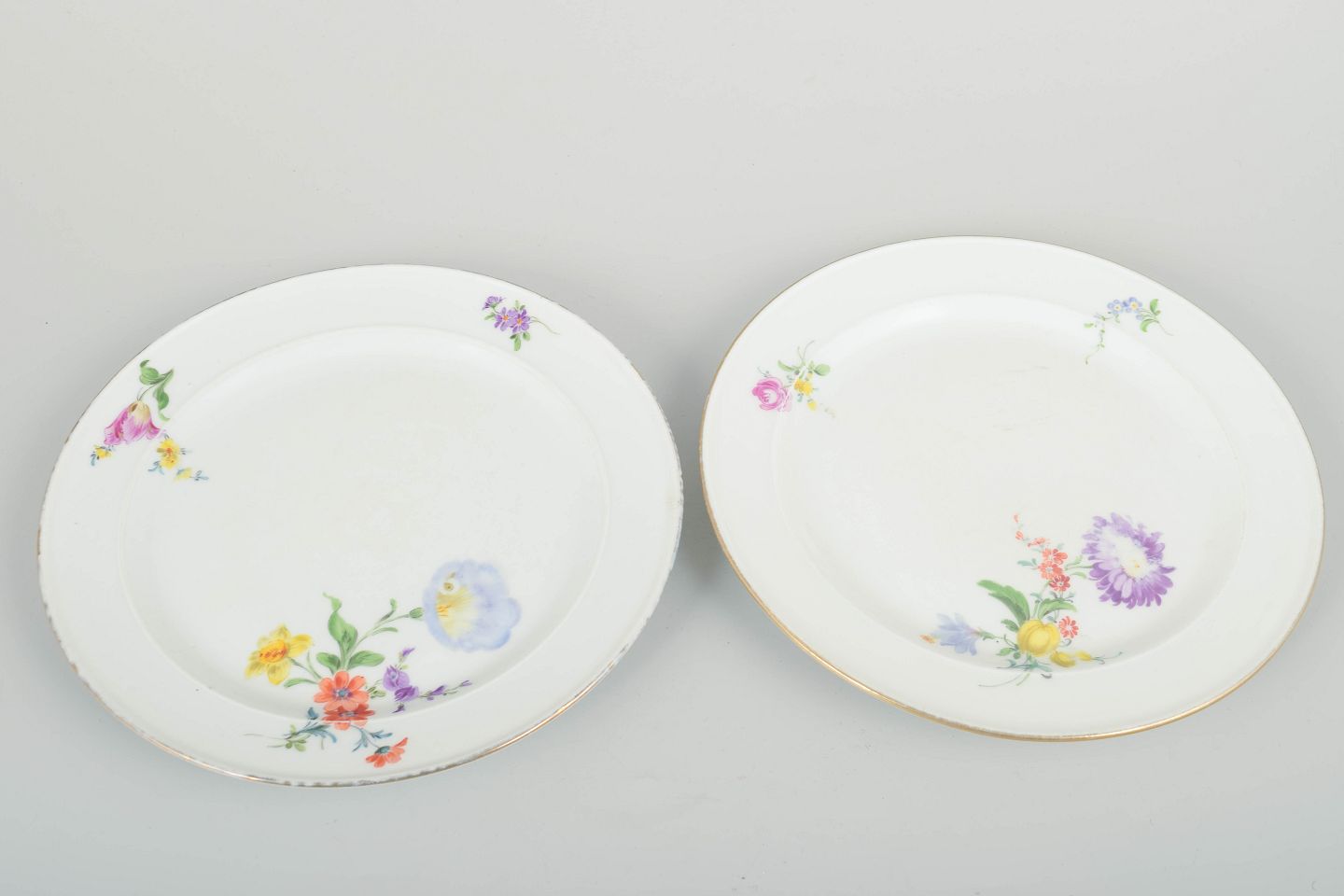 Meissen, to tallerkener, håndmalede.To fine tallerkener i hvidt porcelæn med håndmalede blomsterdekorationer i klassisk Meissen-stil. Begge eksemplarer med delikat guldkant.