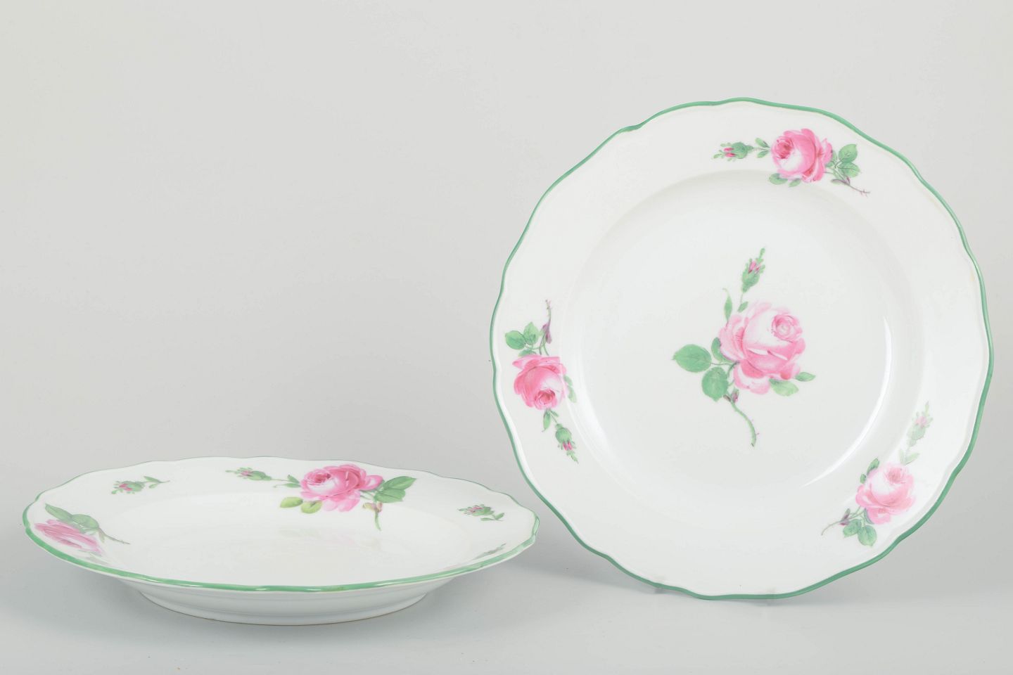 Meissen to middagstallerkener, 1930’erne.Smukke tallerkener i hvidt porcelæn med håndmalede lyserøde roser og grøn bort langs den svungne kant. Klassisk Meissen-kvalitet og elegant dekoration i tidstypisk 1930’er-stil.