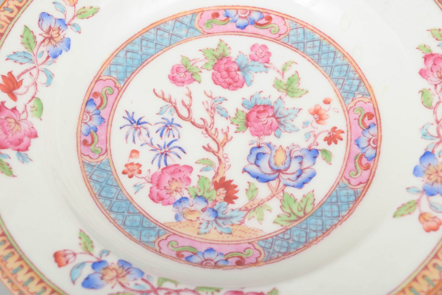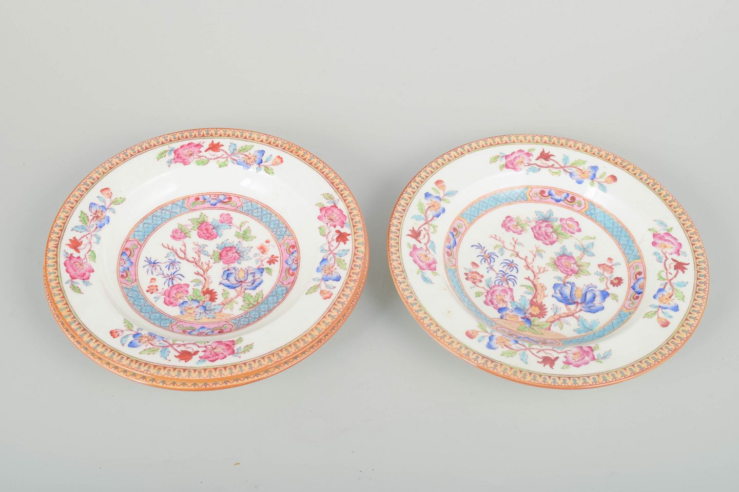 Cauldon China, EnglandTre dybe tallerkener i fajance med farverig, orientalistisk inspireret blomsterdekoration i rosa, blå og turkis nuancer. Klassisk Cauldon-dekor med dekorativ kant i varme toner.