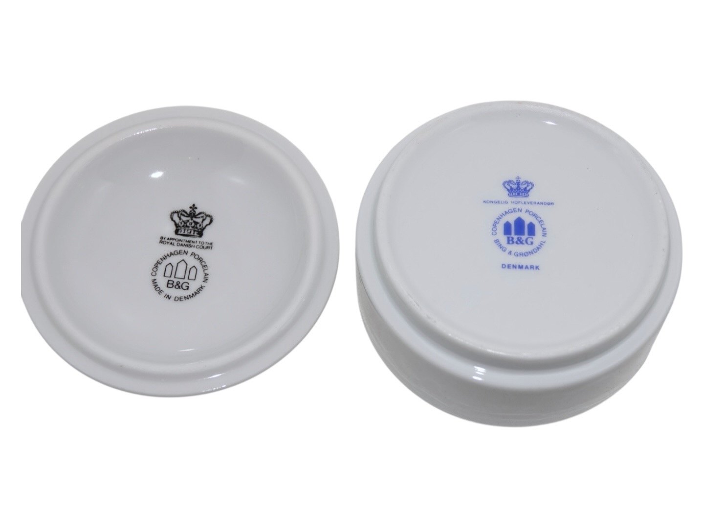 Bing & Grøndahl, rund bonbonniere med julenisse der bærer æbleskiver.Af fabriksmærket kan det udledes, at denne er produceret mellem 1970 og 1983.