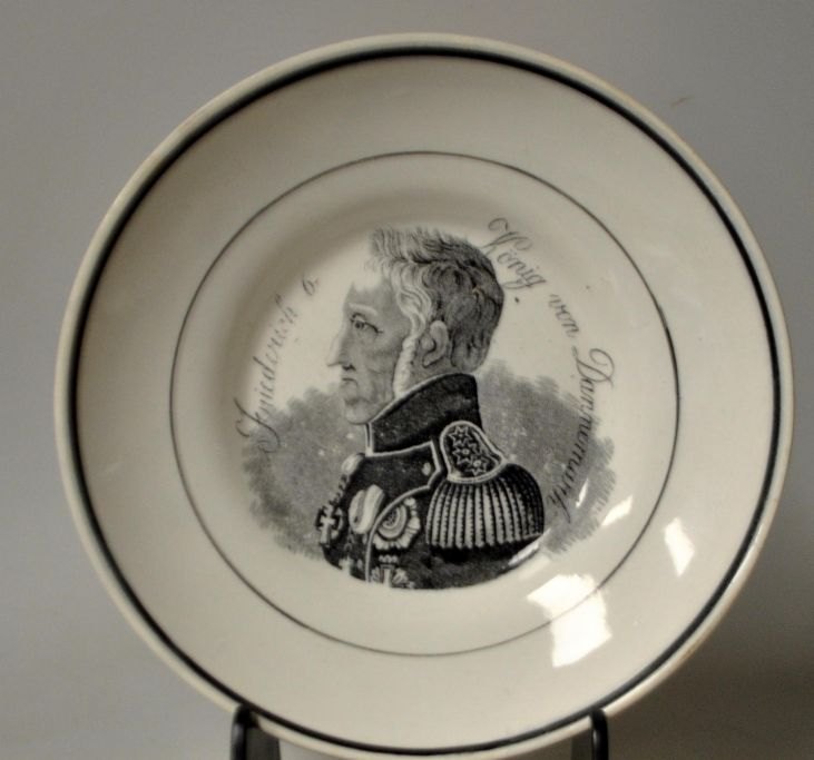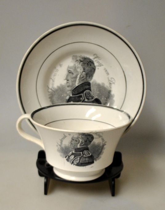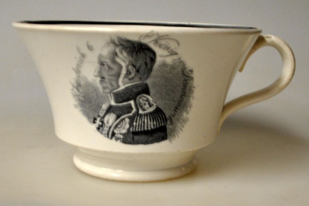Kaffeetasse mit Untertasse, Fayence, 19. Jahrhundert. Mit dem Porträt König Friedrich VI. und dem deutschen Text „Friedrich 6, König von Dannemark“ in Transferdrucktechnik. Tasse ist aus Fayence mit grünen Glasurlinien. Tasse: Höhe: 7,5 cm, Durchmesser: 12,5 cm. Untertasse: Durchmesser: 17 cm. Die Untertasse ist mit einem Anker und der Punze „BF 2“ versehen.Friedrich VI. war von 1808 bis 1839 König von Dänemark.