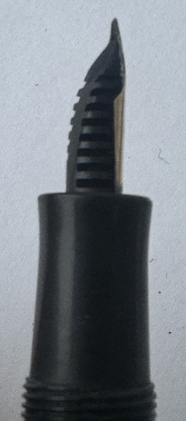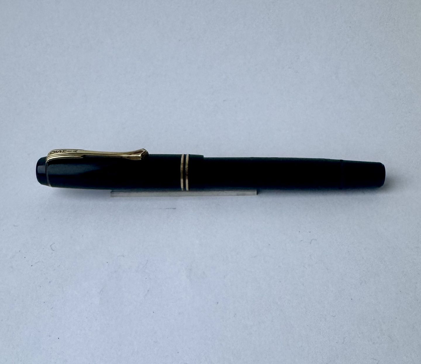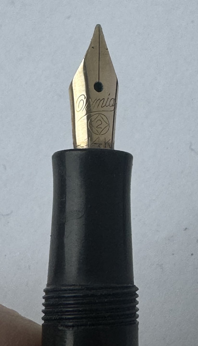 Black Osmia fountain pen with piston filler that needs to be repaired before the fountain pen can absorb ink and write again. Appears in good condition without damage. All parts original to this model including an Osmia number 2 gold nib in 14 carats. Length 11,5 cm Dealer