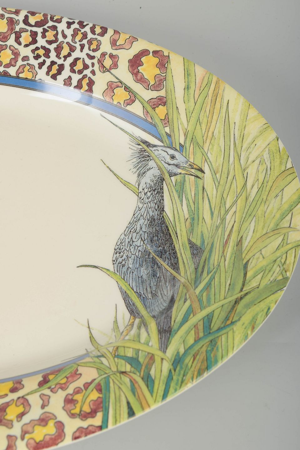 Dekorativt ovalt fajancefad fra Gien i det karakteristiske “Savane”-mønster med farverig bort og naturalistisk motiv. Et markant stykke fra seriens livlige og kunstneriske udtryk.