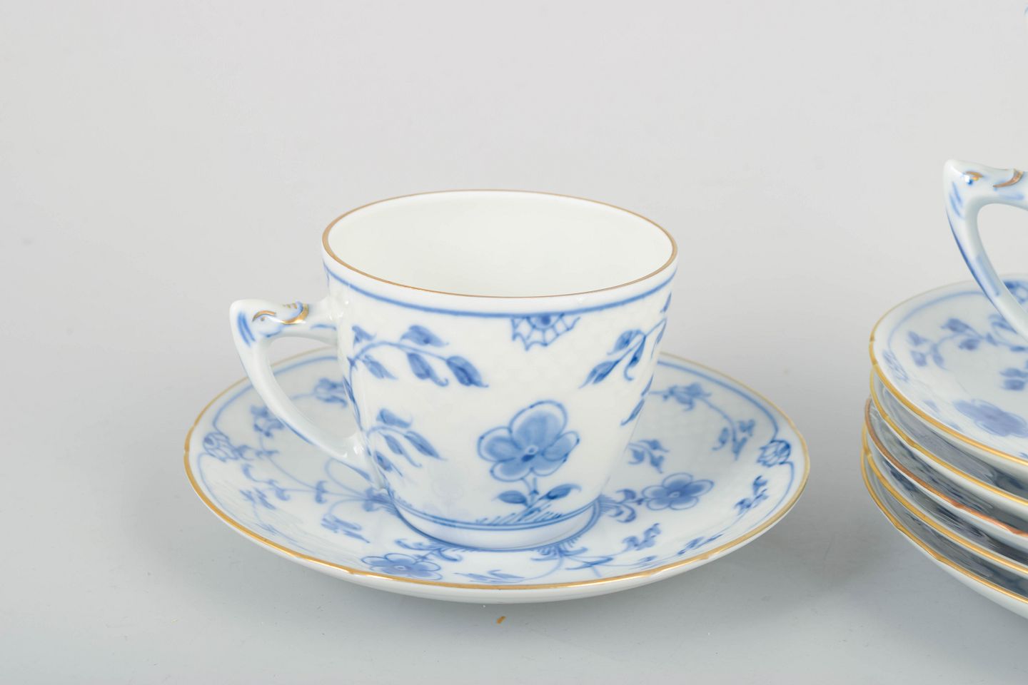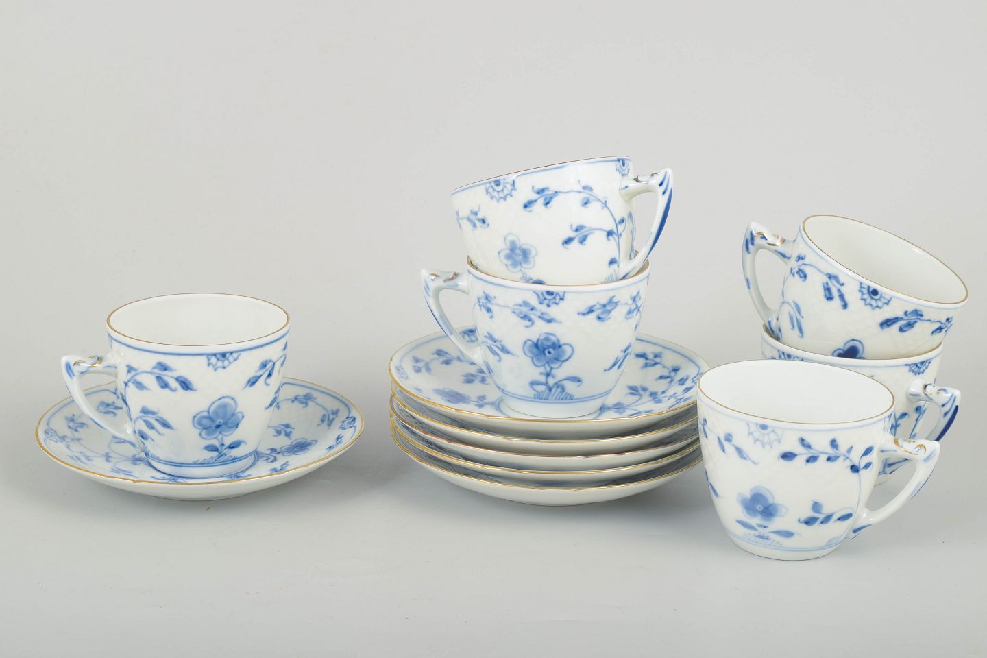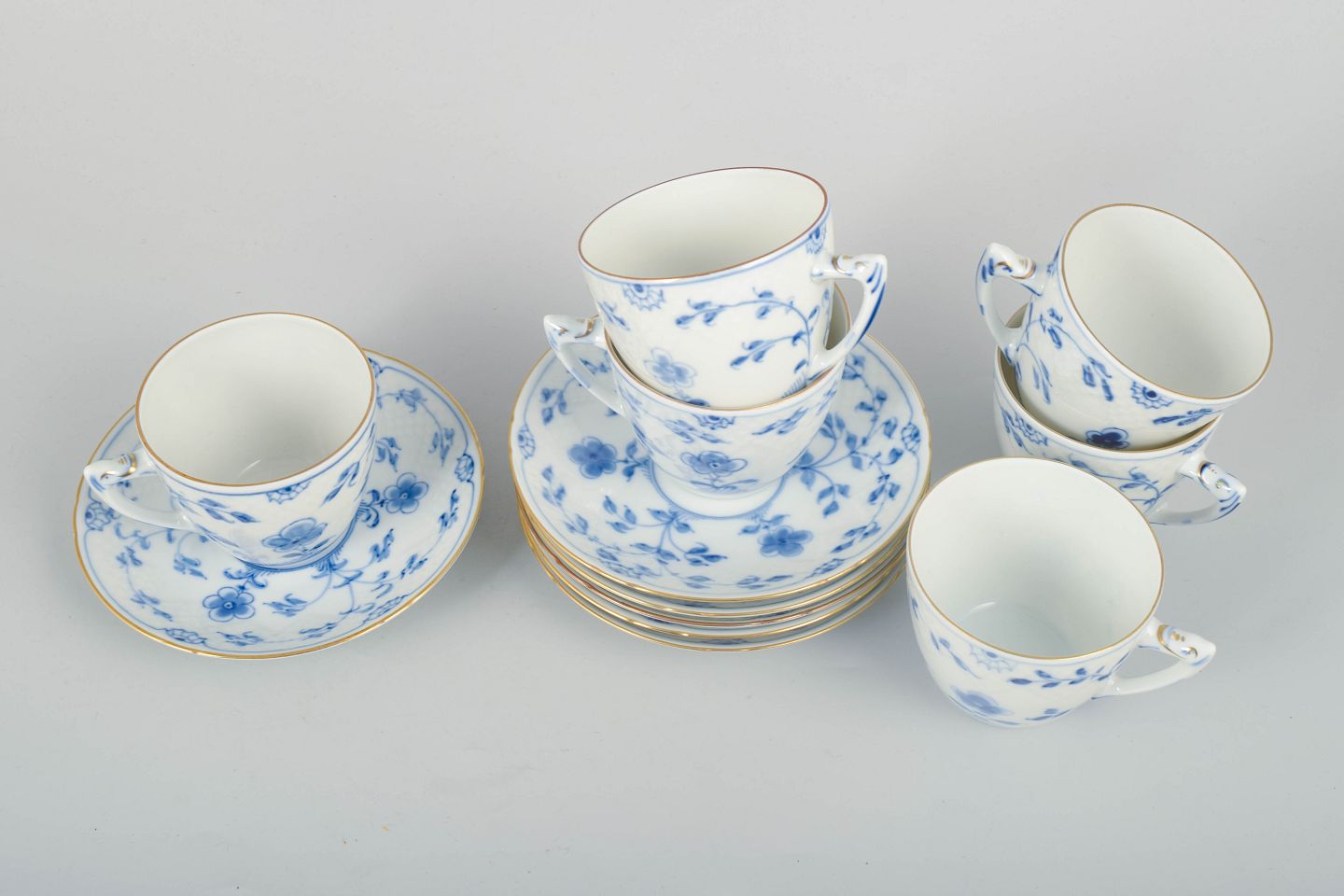Bing & Grøndahl, sæt med seks kaffekopper med underkopper i det klassiske håndmalede dekormønster Kipling med gulddekor. Kopperne viser den karakteristiske blå flora på hvid porcelænsgrund.