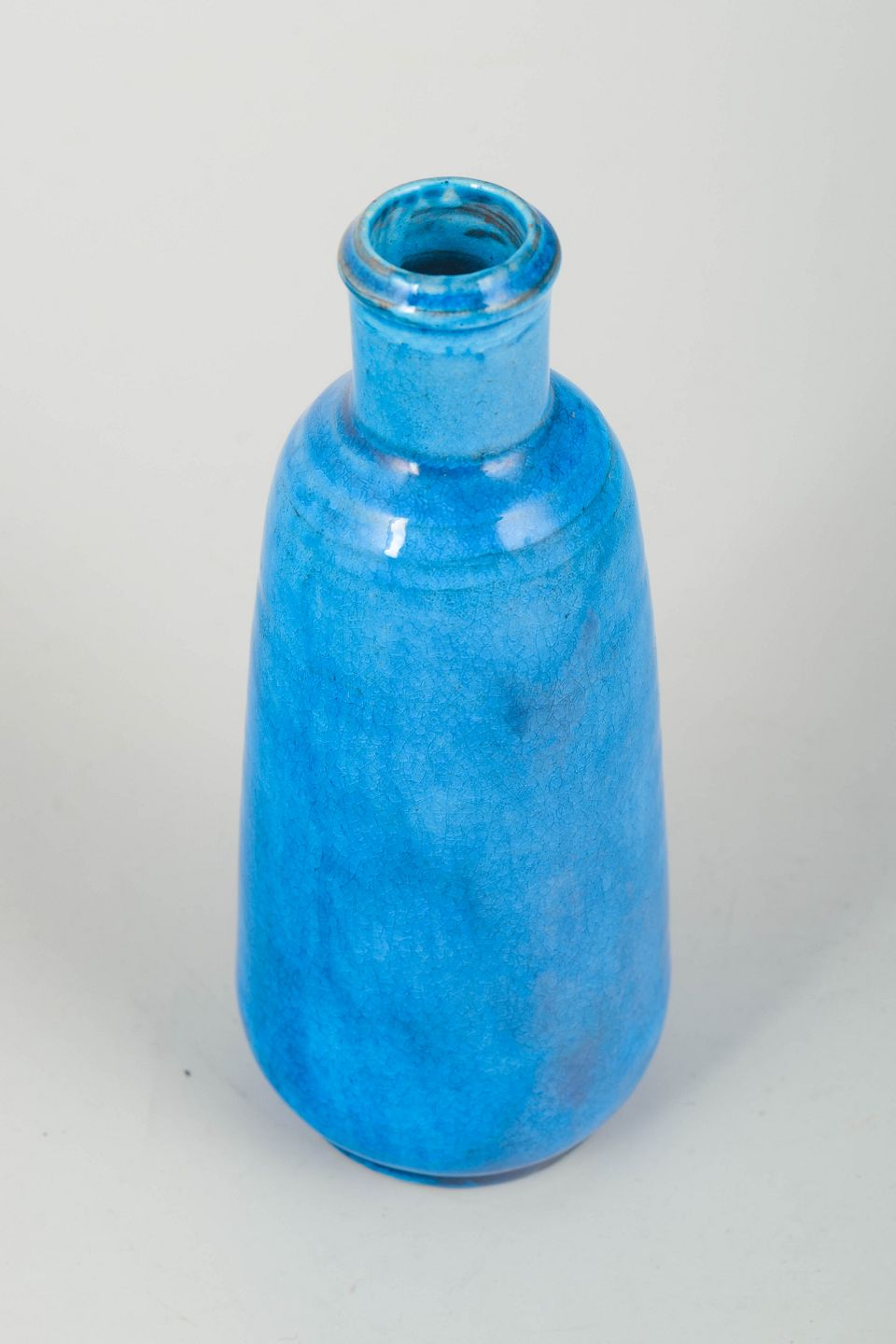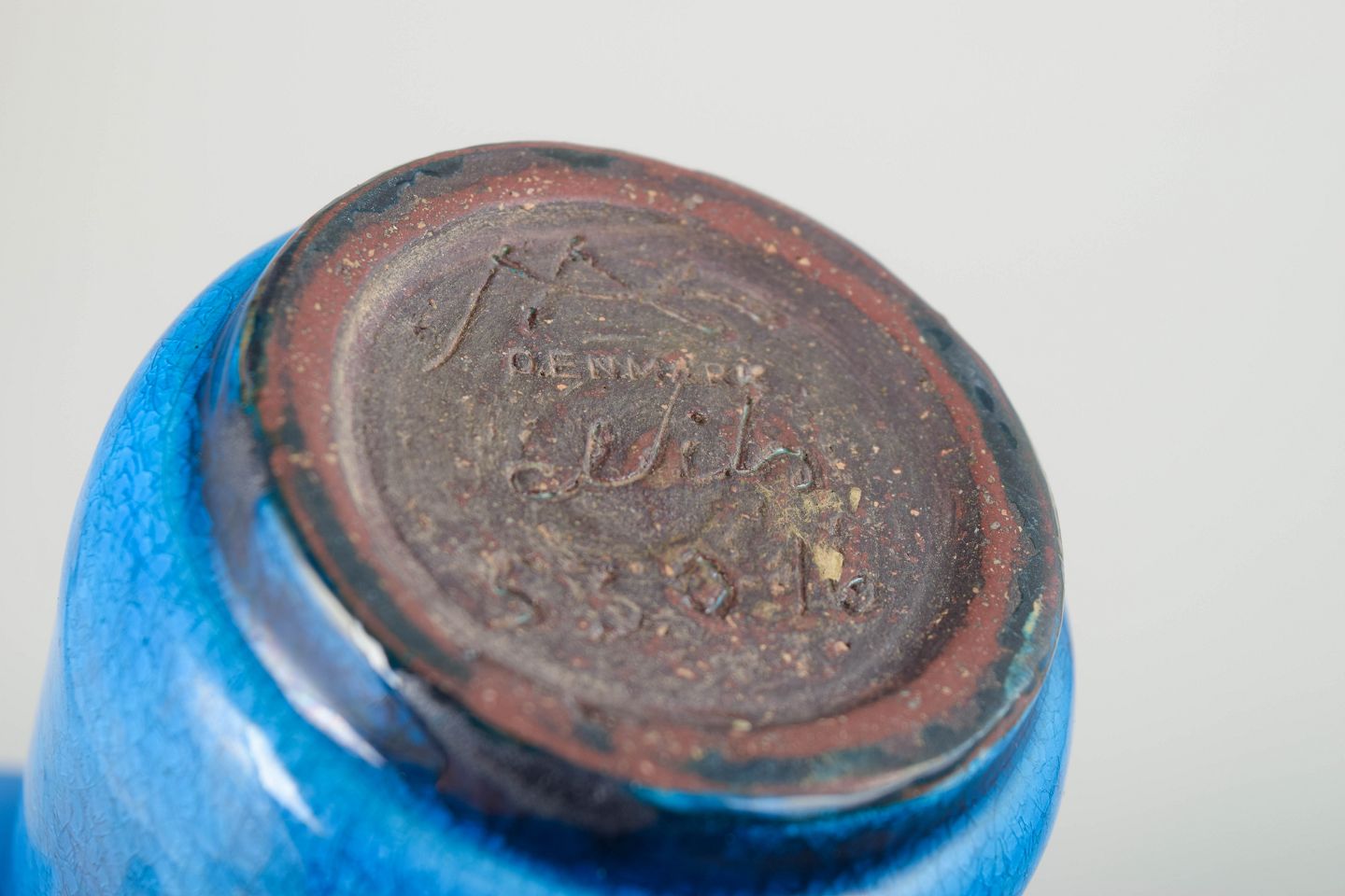 Elegant cylindrisk vase i den ikoniske azurblå glasur, karakteristisk for Kähler-værkstedets produktion i 1960’erne. Formen er let konisk med et smallere mundingsparti og en jævnt påført, levende glasur, der fremhæver den hånddrejede karakter.