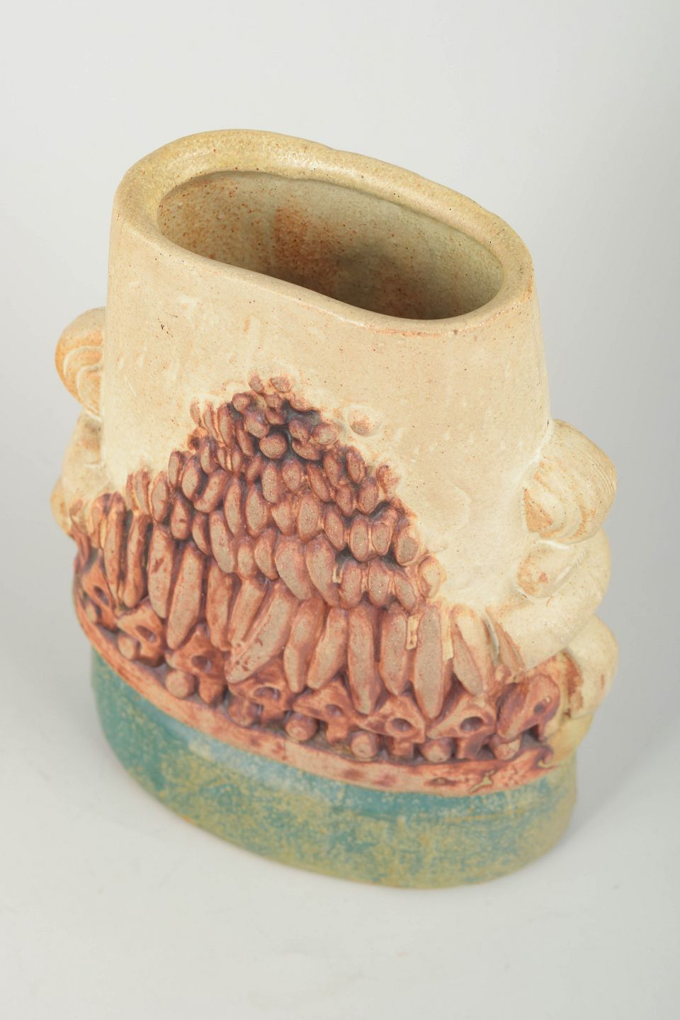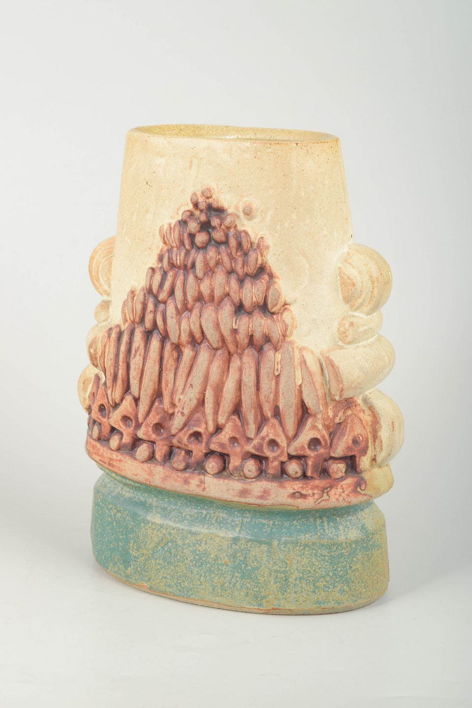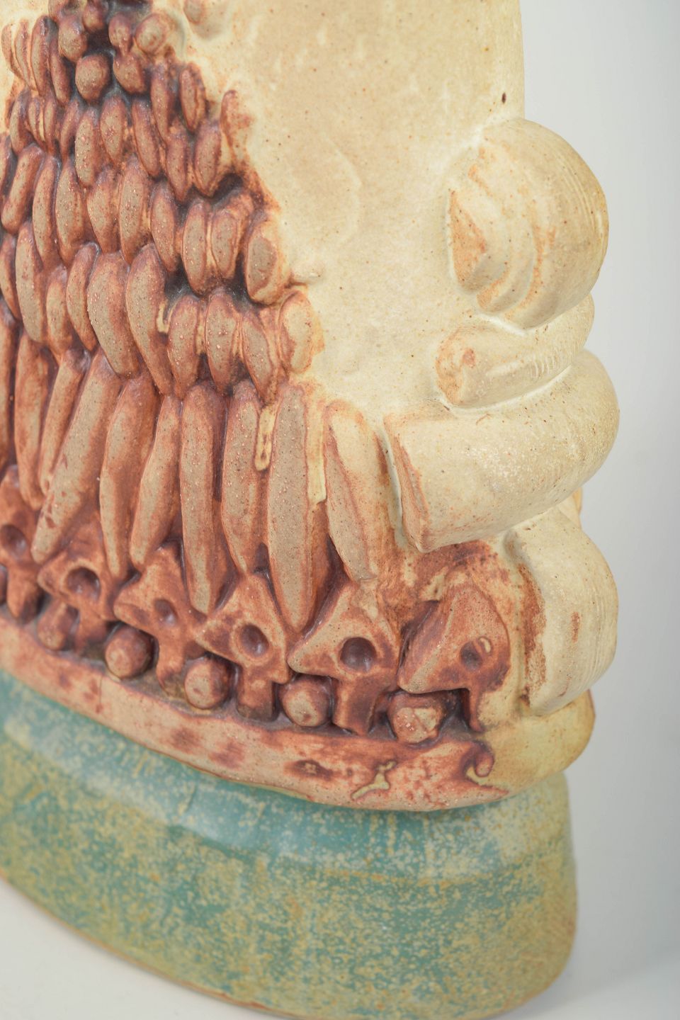 Skulpturel håndglaseret vase i stentøj, typisk for Rookes organiske formsprog med kraftige reliefelementer og taktil overflade.