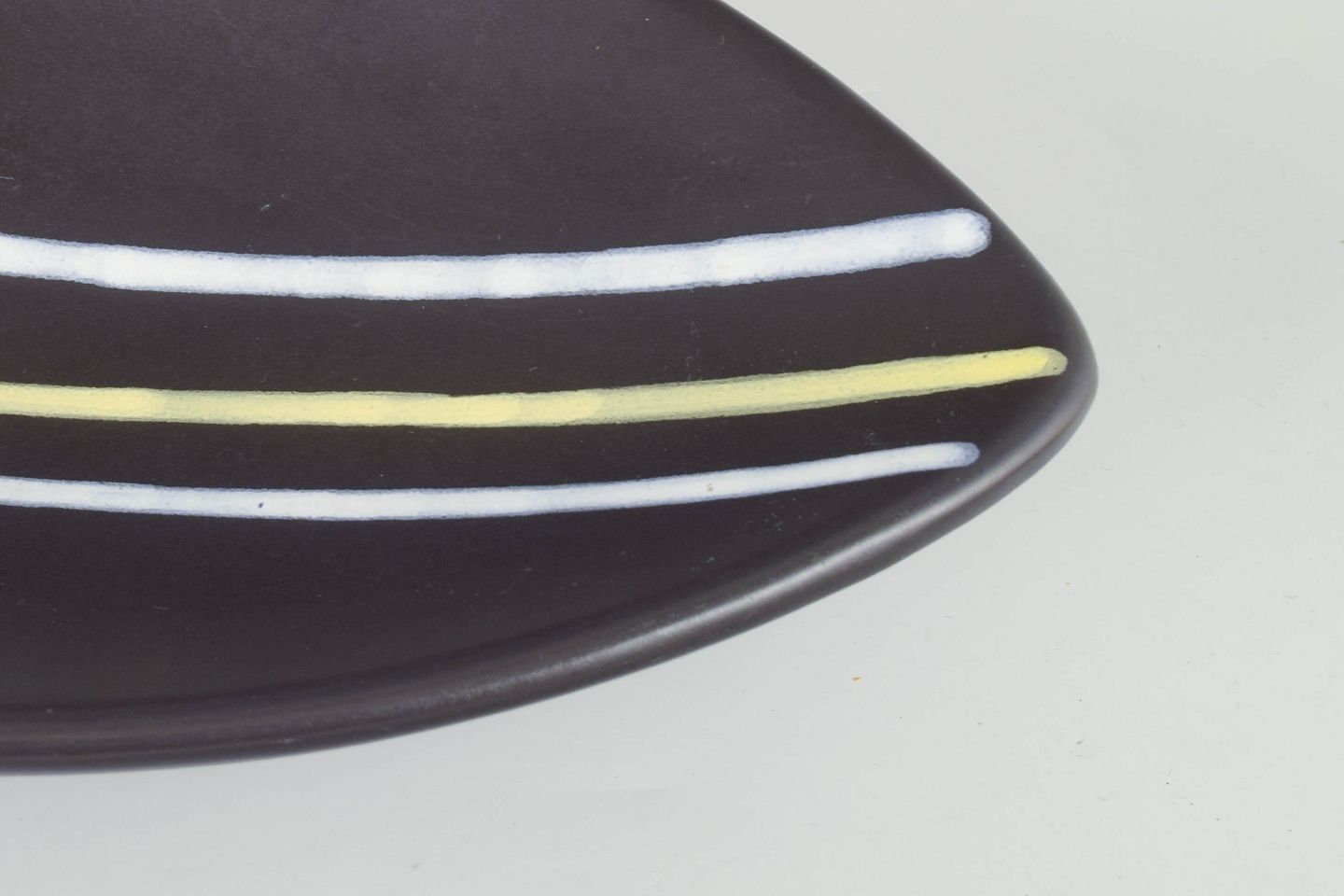 Keramisk skål i den ikoniske “Trio”-serie, dekoreret med grafiske linjer i hvid og gul på mørk baggrund. Elegant, aflang form, typisk for Oldfors’ modernistiske formsprog.