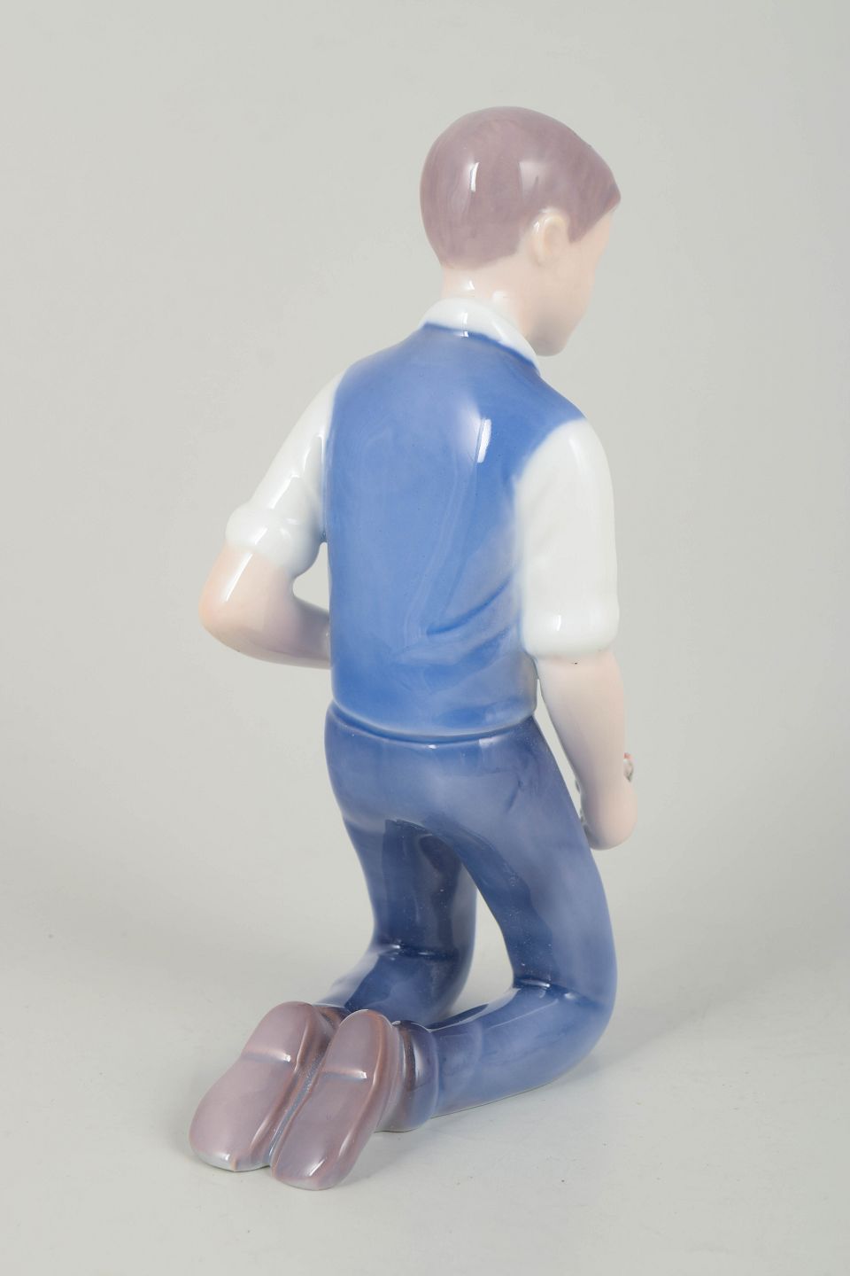 Porcelænsfigur af knælende dreng med blomster i hånden, udført i klassisk glansglasur med bløde blå og rosa nuancer.