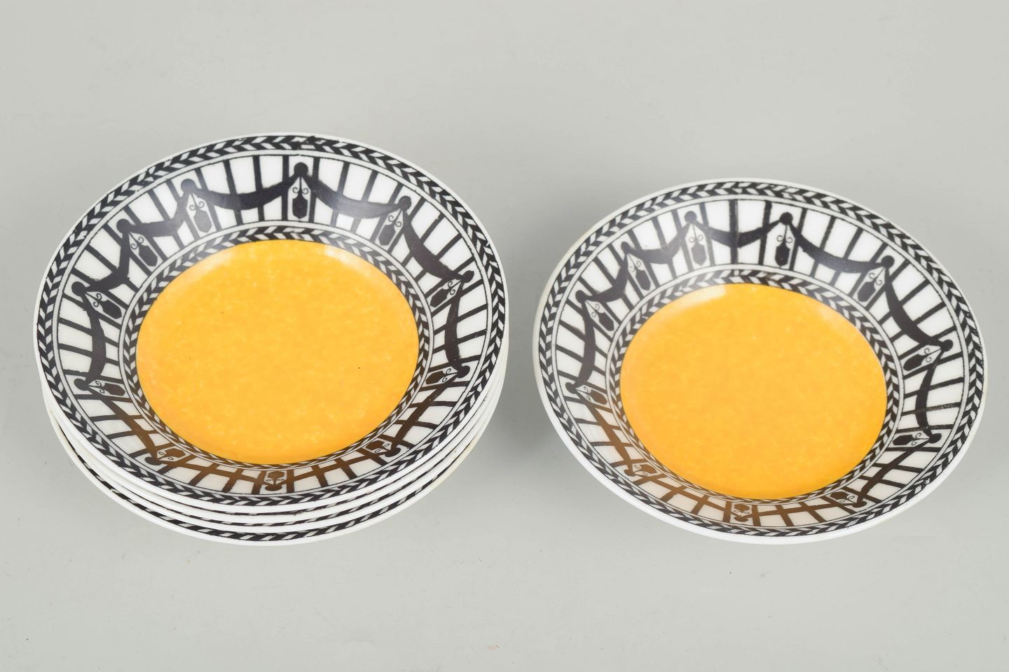 Fem små faienceskåle med gul midte og dekorativ kant i sort-hvidt geometrisk mønster, typisk for tidens ornamentik.