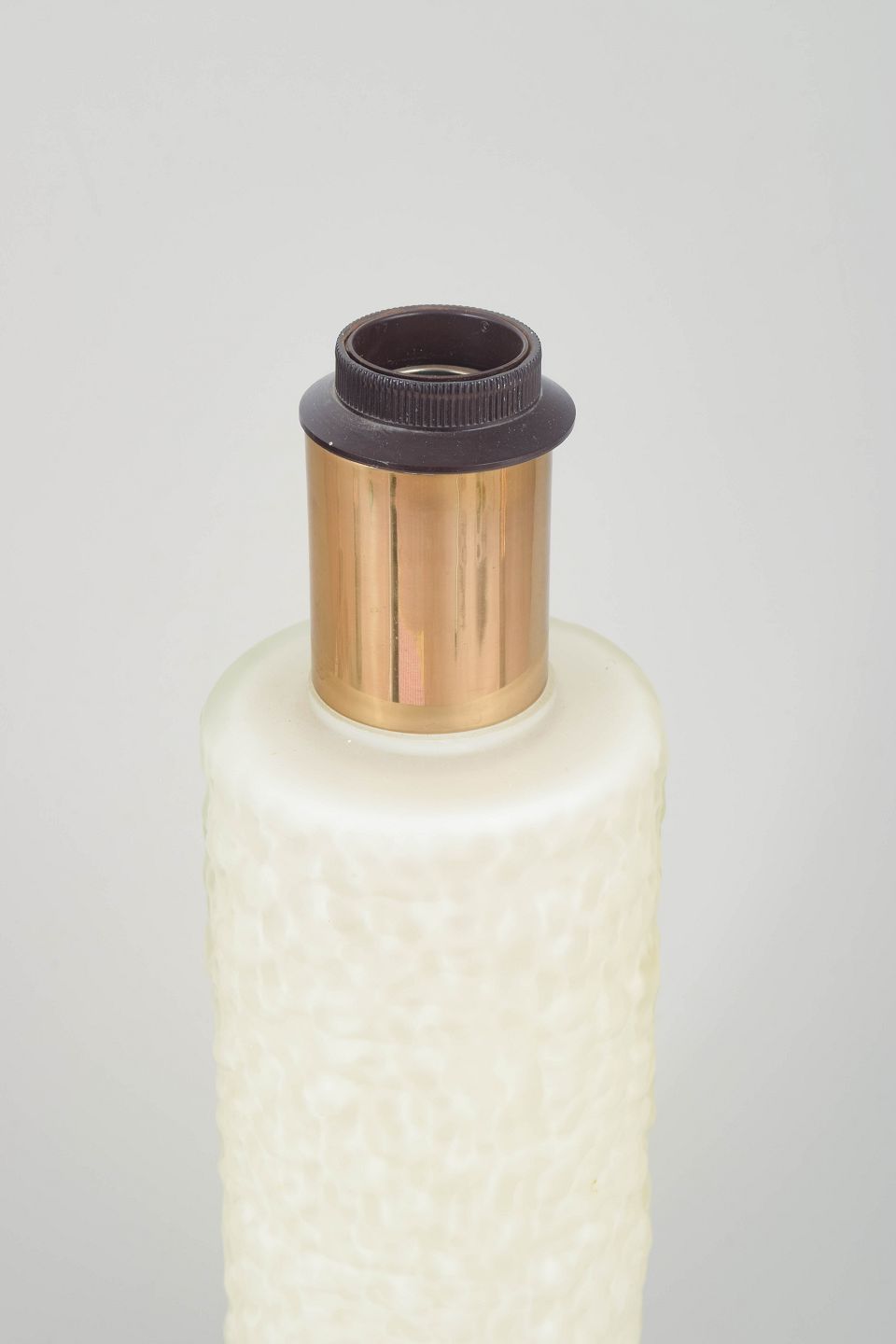 Svensk design – bordlampe i glas og messing, 1970’erne.Elegant bordlampe i presset hvidt glas med struktureret overflade og cylinderformet messingtop. Original ledning ca. 2 meter. Et karakteristisk stykke skandinavisk 70’er-belysningsdesign med enkel, men markant materialekontrast.