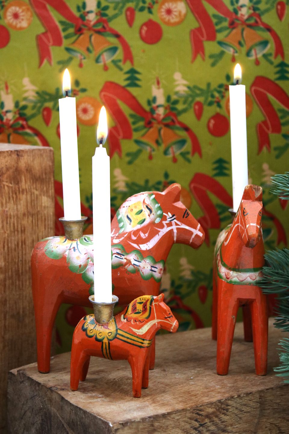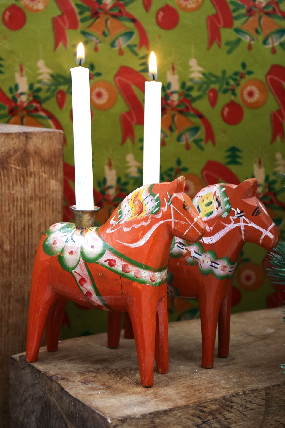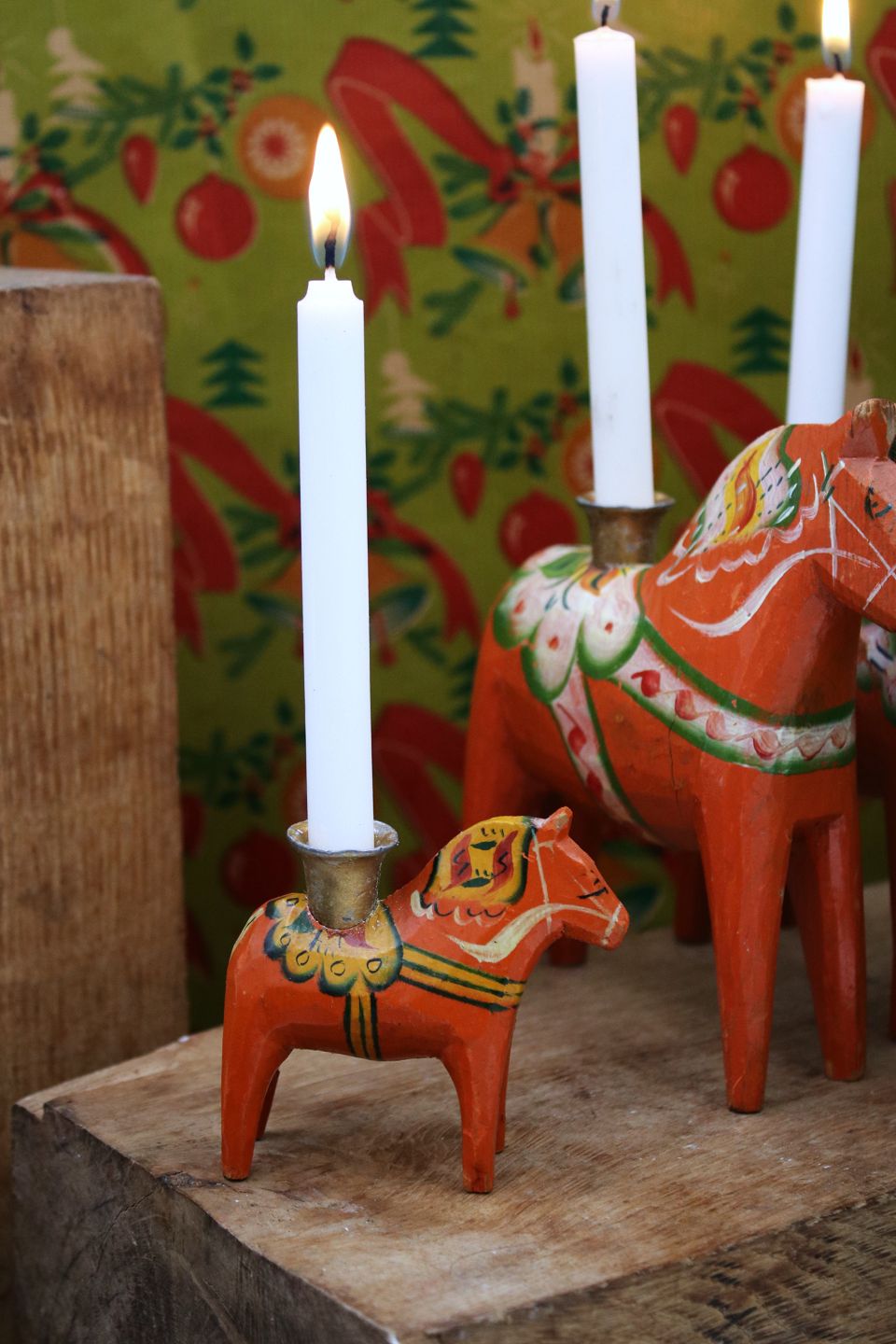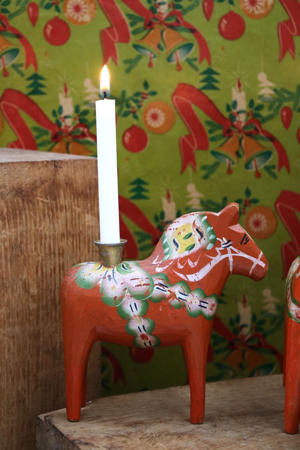Gammel svensk Dalarhest julelysestage med plads til et lille julestearinlys på ryggen.