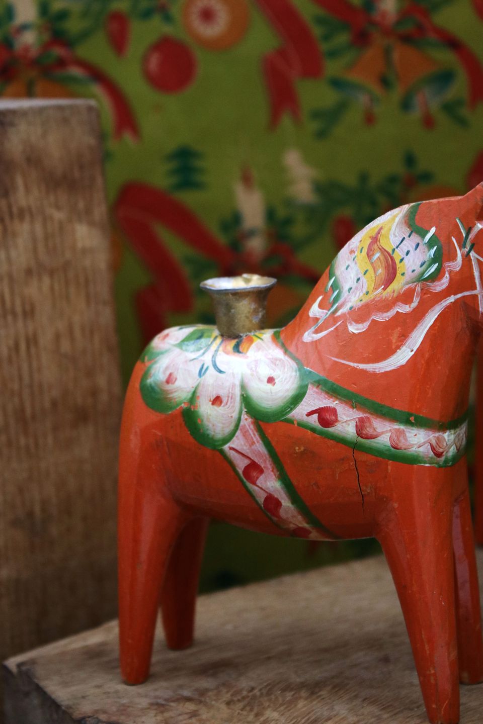 Gammel svensk Dalarhest julestage med plads til et lille julestearinlys på ryggen...