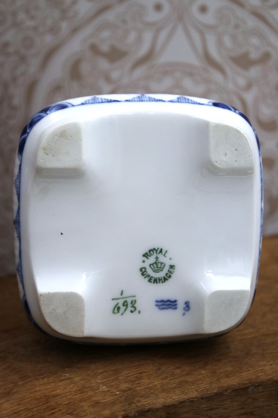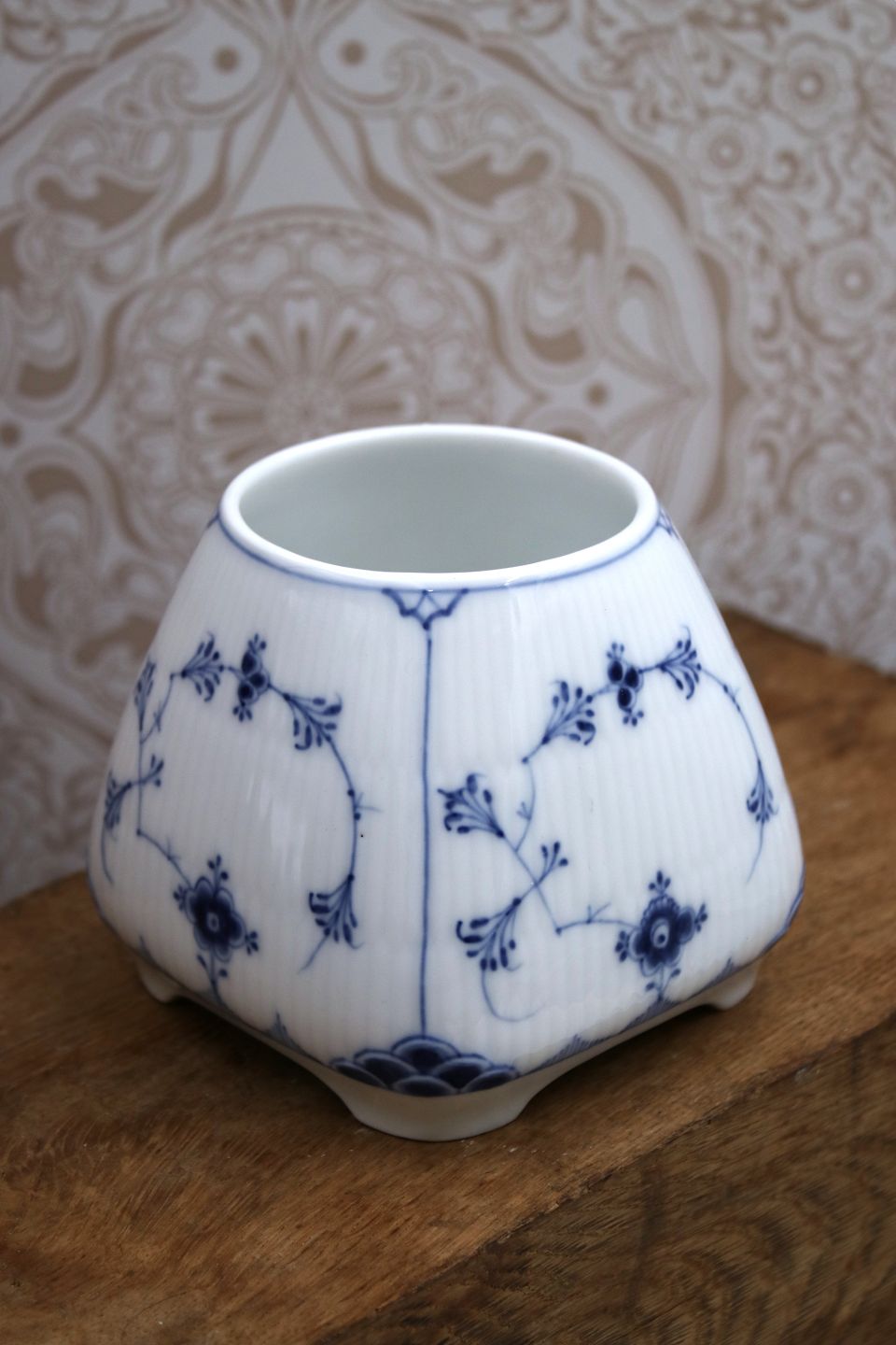 Sjælden Royal Copenhagen Musselmalet Riflet vase.H: 9,5cm. 11x11cm.